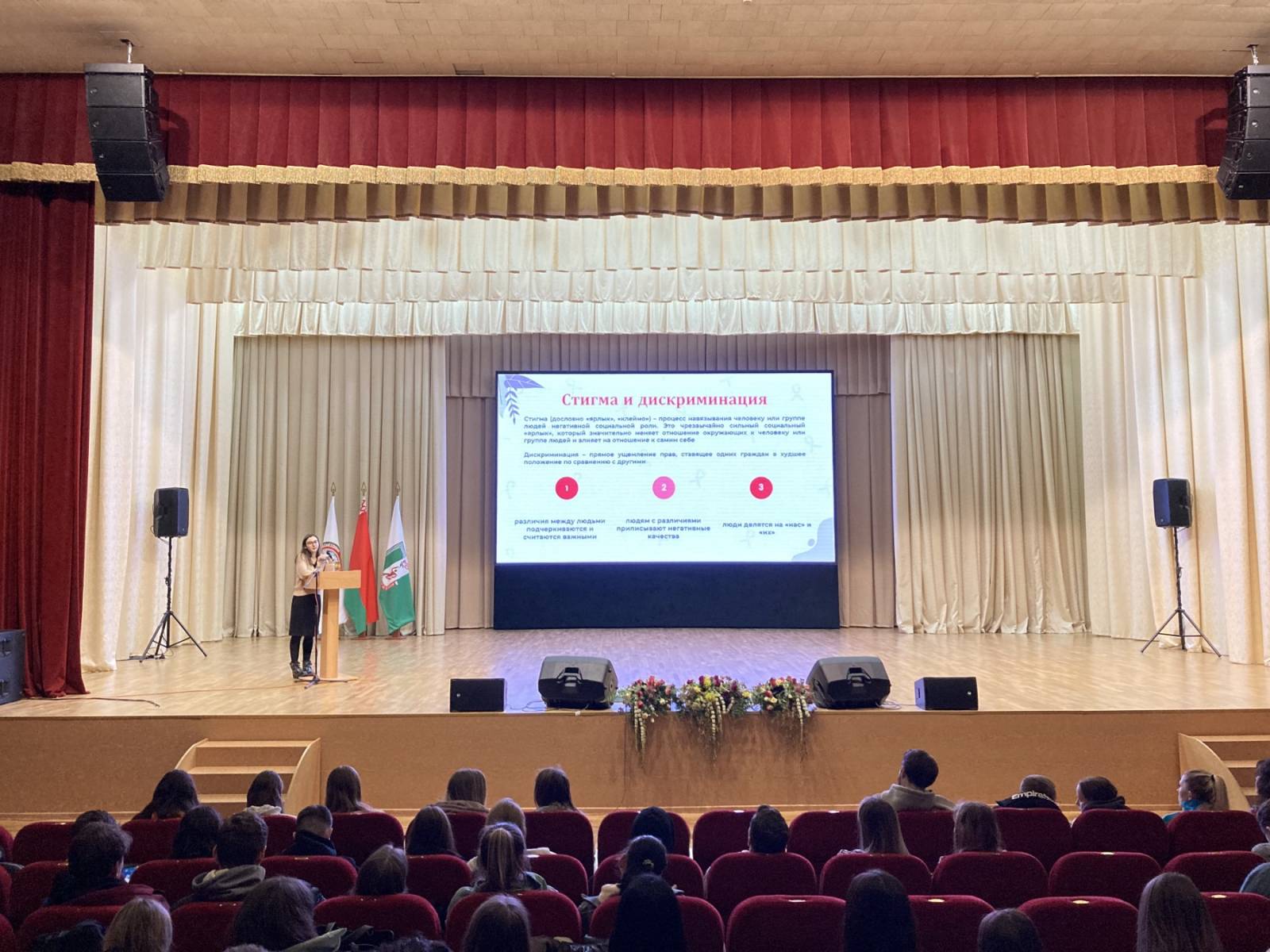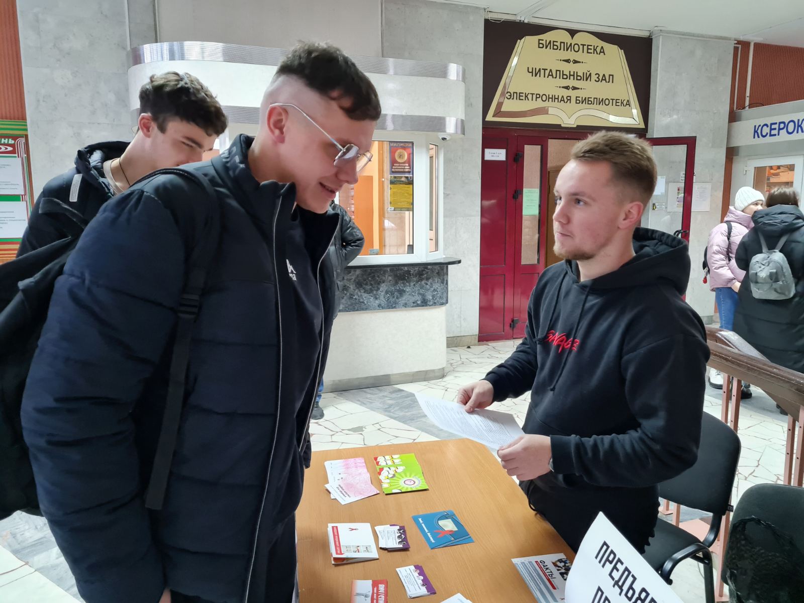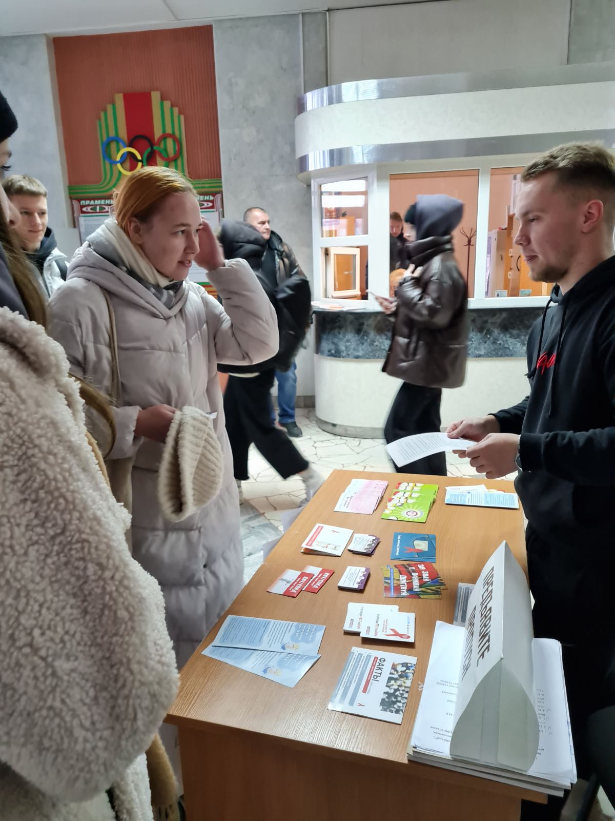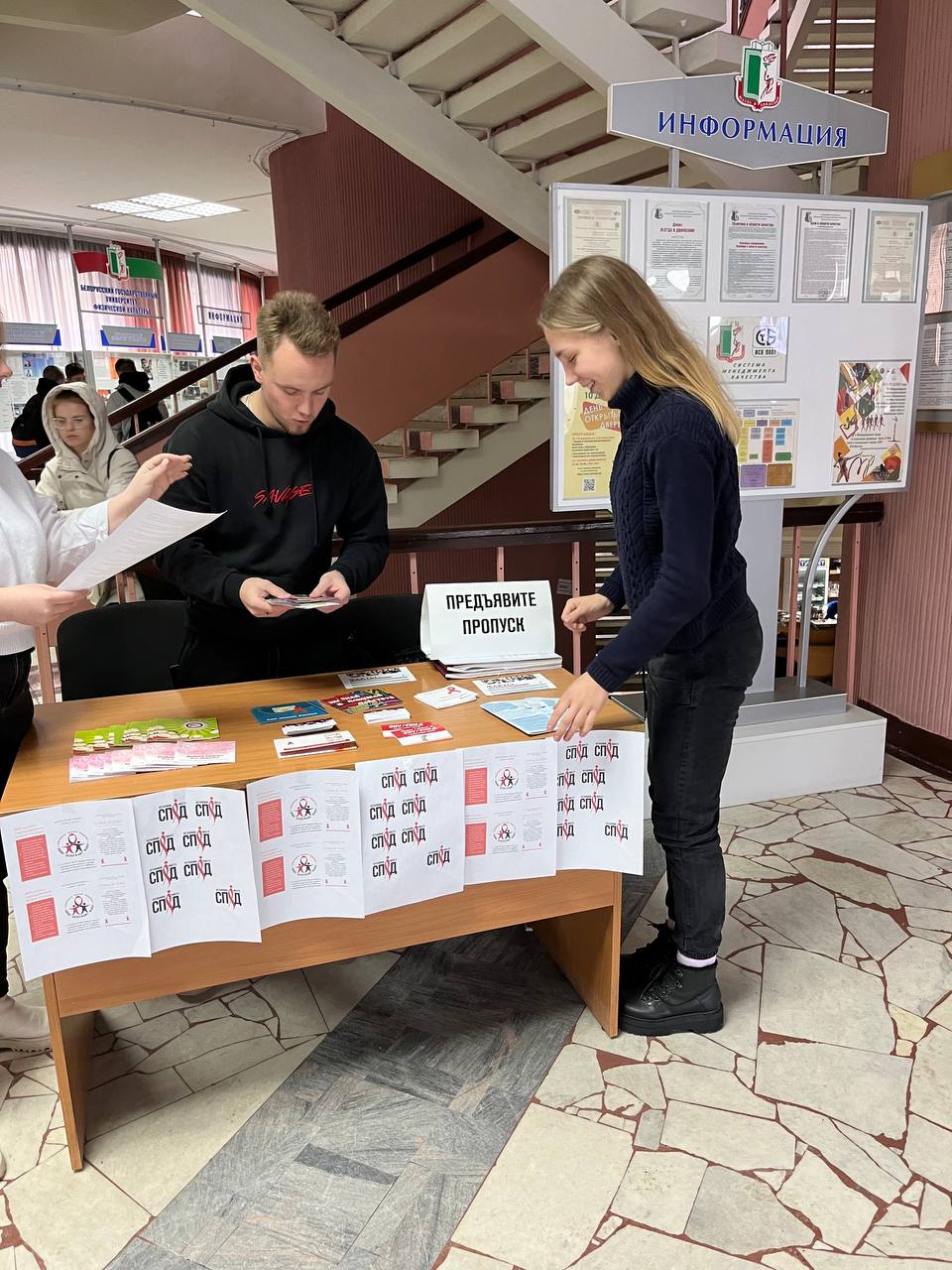 В актовом зале университета прошла встреча студентов с Горошко Инной Сергеевной, врачом-эпидемиологом Центра гигиены и эпидемиологии Центрального района г. Минска в рамках которой студенты получили исчерпывающую информацию о том, что решающую роль в распространении ВИЧ-инфекции играет модель жизненного поведения человека (насколько рискованный в плане инфицирования ВИЧ образ жизни ведет человек). Среди студентов был распространен информационный материал, также экспресс-тестирование на ВИЧ-инфекцию по слюне.