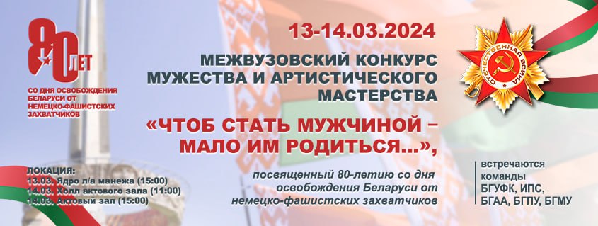 13-14 марта 2024 года в университете пройдет Межвузовский конкурс мужества и таланта «Чтоб стать мужчиной — мало им родиться», посвященный 80-летию со дня освобождения Республики Беларусь от немецко-фашистских захватчиков.