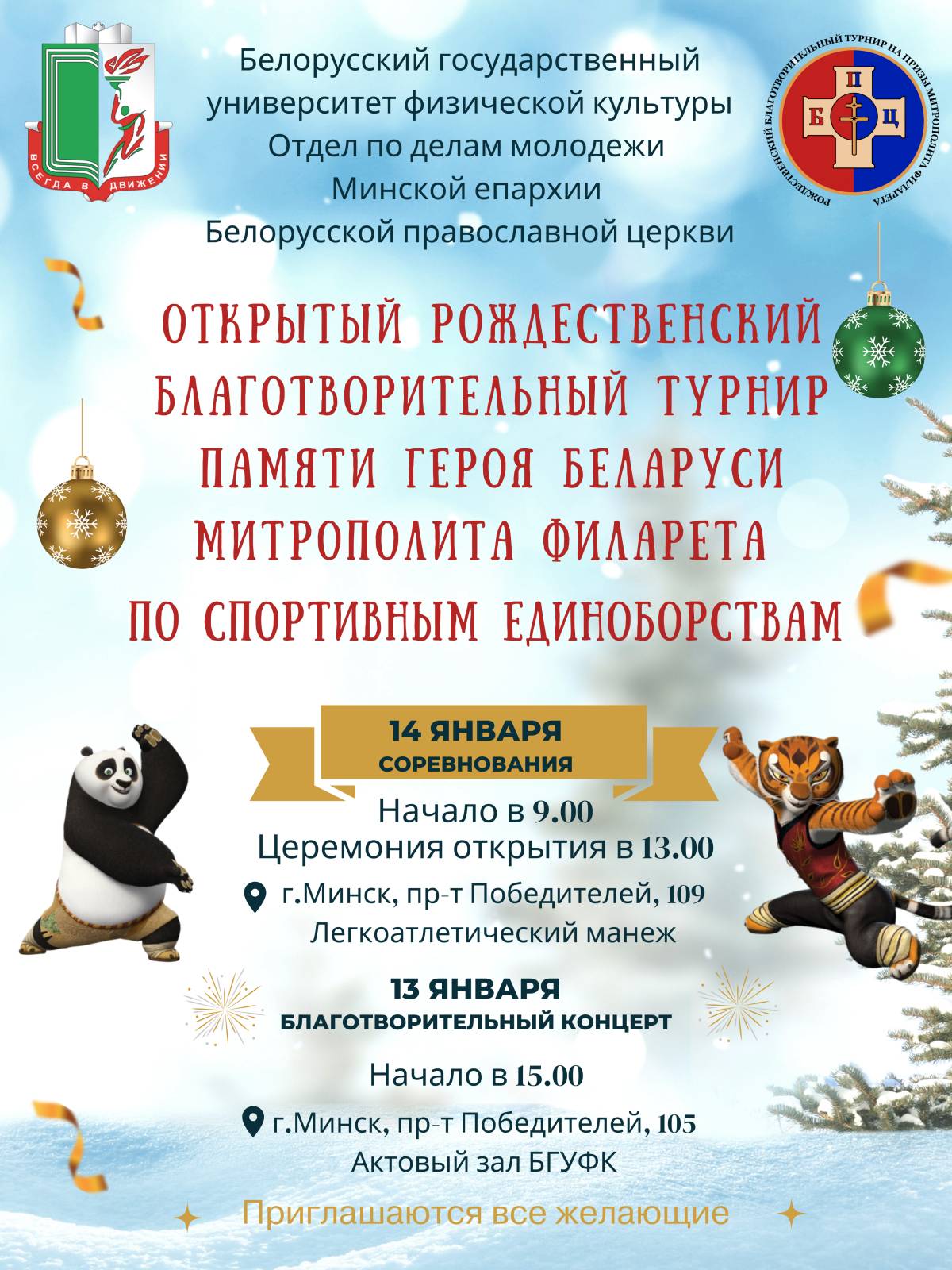 Девятый раз мы встречаем Рождество с особым настроением – не только как праздник, но и как возможность оказать помощь тем, кто в ней нуждается, занимаясь при этом любимым делом, тем, что мы по-настоящему умеем – спортивно-боевыми единоборствами. В рамках акции «Наши дети» будет организован Турнир по спортивно-боевым единоборствам, все сборы от которого будут направлены на приобретение необходимых средств гигиены для проживающих в психоневрологических интернатах Республики Беларусь.