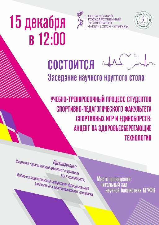 15 декабря в 12.00 спортивно-педагогический факультет спортивных игр и единоборств совместно с учебно-исследовательской лабораторией функциональной диагностики и восстановления технологий проводит заседание научного круглого стола «Учебно-тренировочный процесс студентов спортивно-педагогического факультета спортивных игр и единоборств: акцент на здоровьесберегающие технологии».