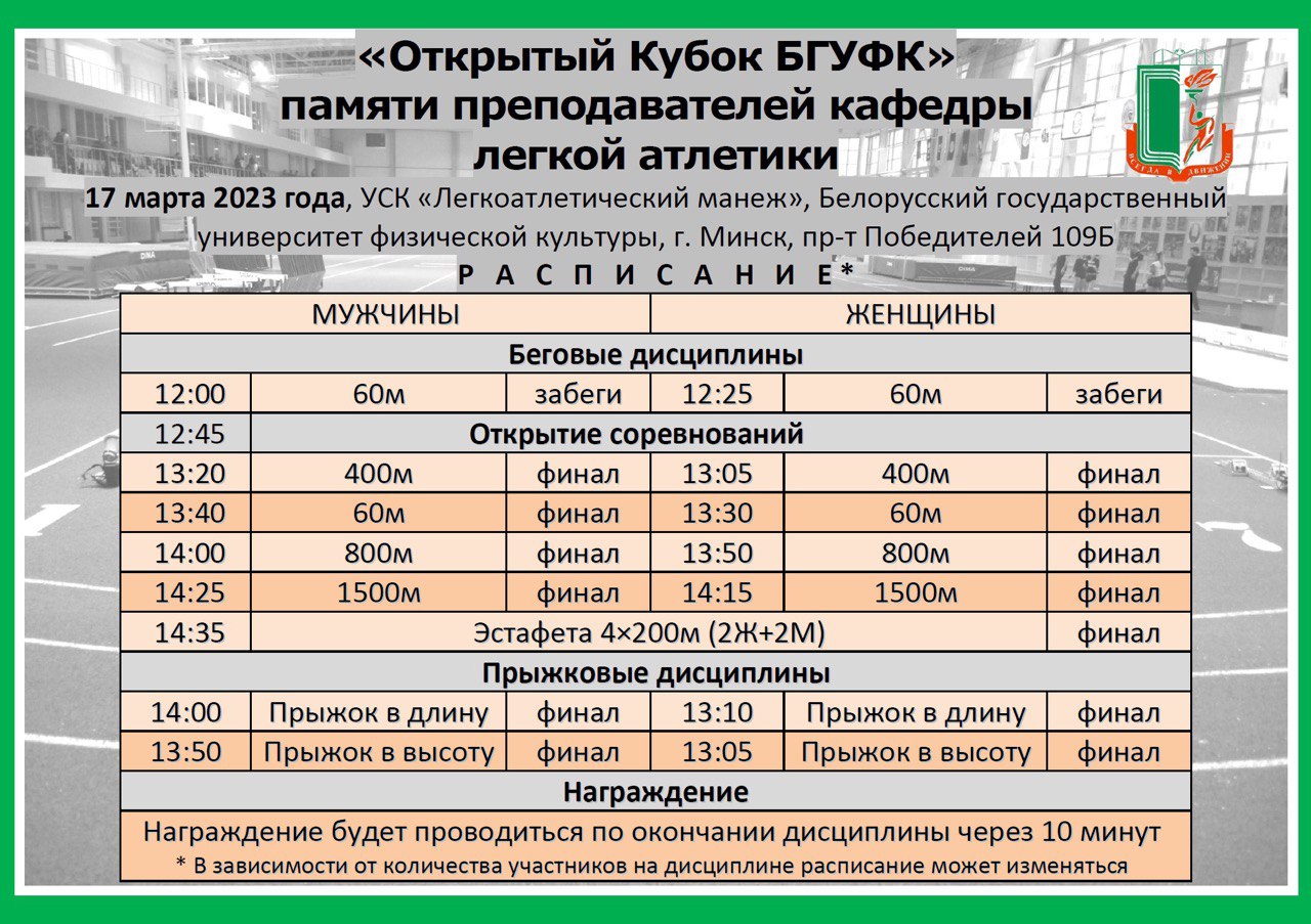 17 марта 2023 года в учебно-спортивном корпусе «Легкоатлетический манеж» Белорусского государственного университета физической культуры (г. Минск, пр. Победителей, 109Б) пройдут соревнования по легкой атлетике в помещении «Открытый Кубок БГУФК» памяти преподавателей кафедры легкой атлетики.