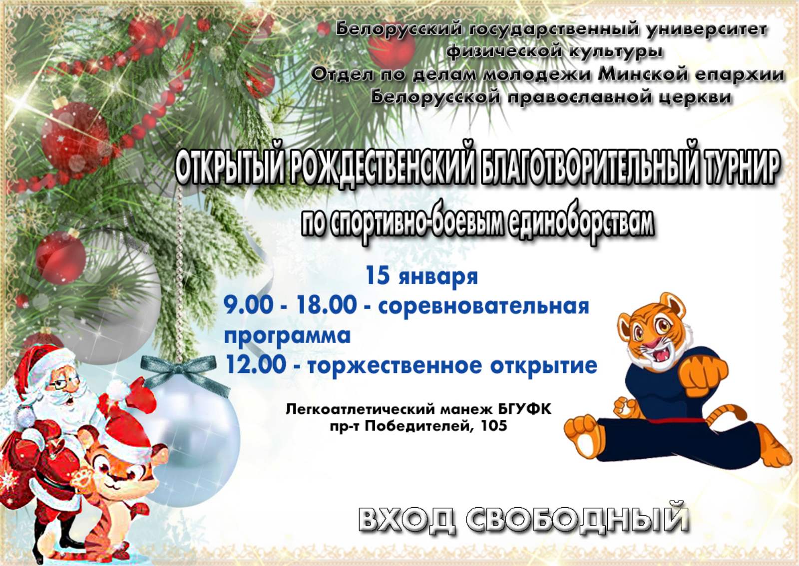 Учреждение образования «Белорусский государственный университет физической культуры» совместно с Белорусской православной церковью, федерациями по видам единоборств, отделом молодежи Минской епархии Белорусской православной церкви, обществом с ограниченной ответственностью «Спортивный клуб «УниверПрофи» с целью оказания помощи детям с ограниченными возможностями и популяризации здорового образа жизни проводит 15.01.2022 VIII Рождественский благотворительный турнир по спортивно-боевым единоборствам. Средства, полученные от проведения турнира, будут направлены на приобретение необходимых средств гигиены для детей, проживающих в психоневрологических интернатах Республики Беларусь.