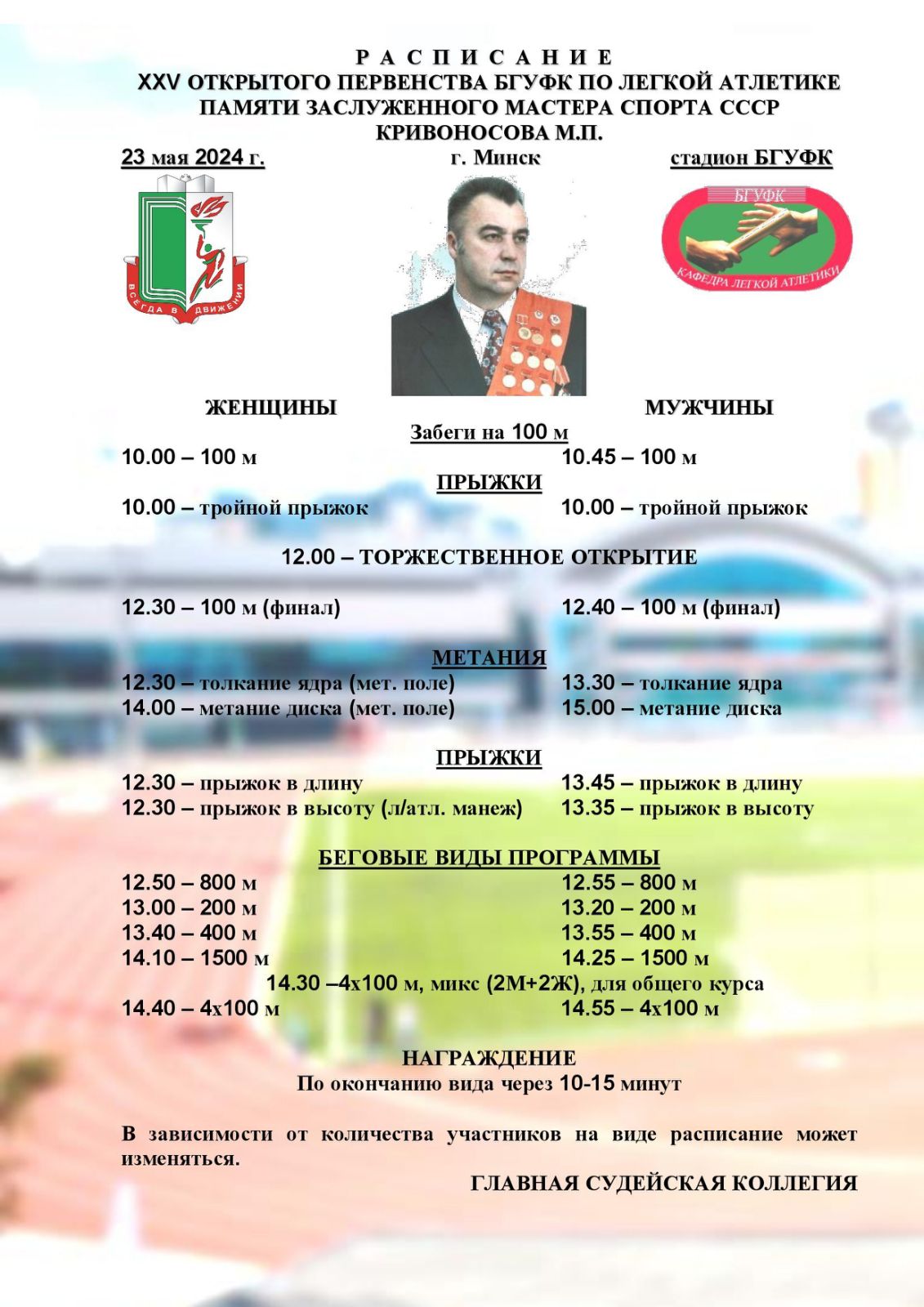 23 мая 2024 года состоится открытое первенство БГУФК по легкой атлетике памяти Заслуженного мастера спорта СССР М.П.Кривоносова. Место проведения – стадион БГУФК, поле для метания БГУФК, УСК «Легкоатлетический манеж» БГУФК.