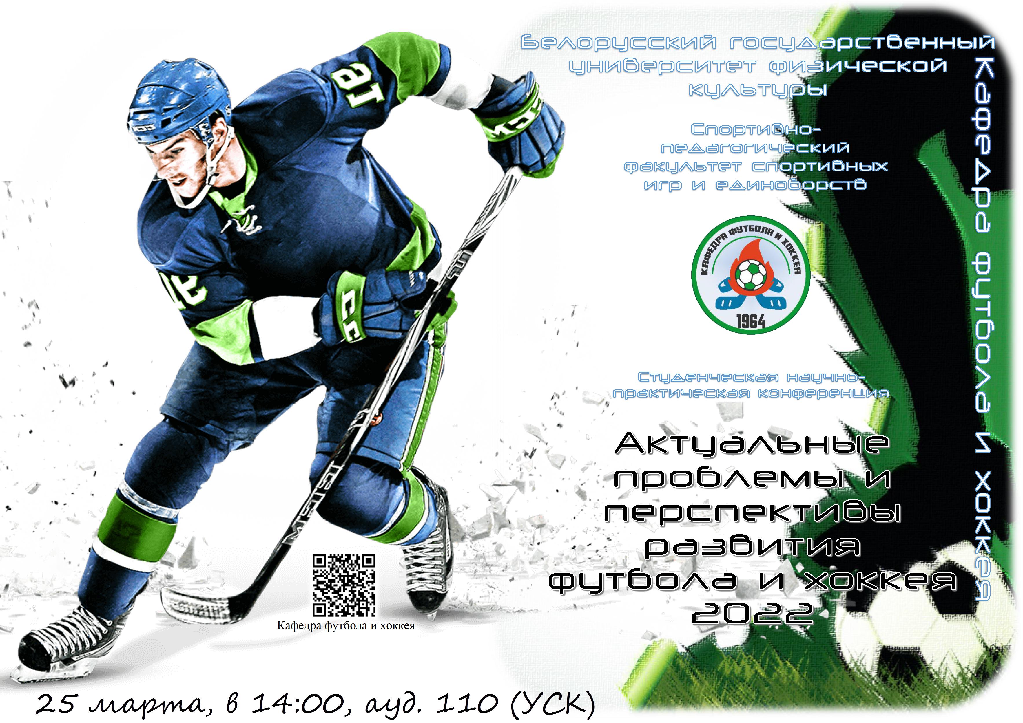 25 марта, в 14:00 в учебно-спортивном корпусе, ауд. 110 кафедрой футбола и хоккея проводится студенческая научно-практическая конференция «Актуальные проблемы и перспективы развития футбола и хоккея — 2022».