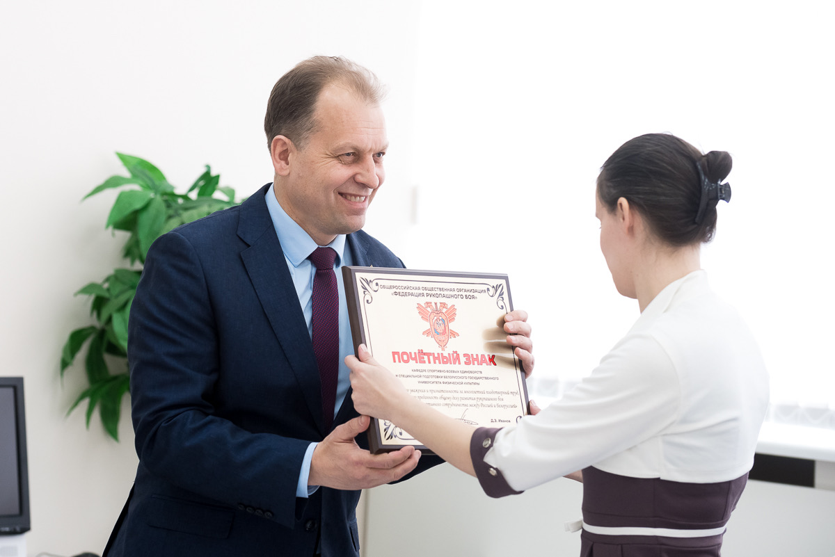 Также пользуясь случаем хочется вручить «Почетный знак» кафедре спортивных единоборств БГУФК в знак глубокого уважения и признательности за многолетний плодотворный труд, искреннюю преданность общему делу, за развитие рукопашного боя и укрепление научного сотрудничества между Россией и Беларусью».
