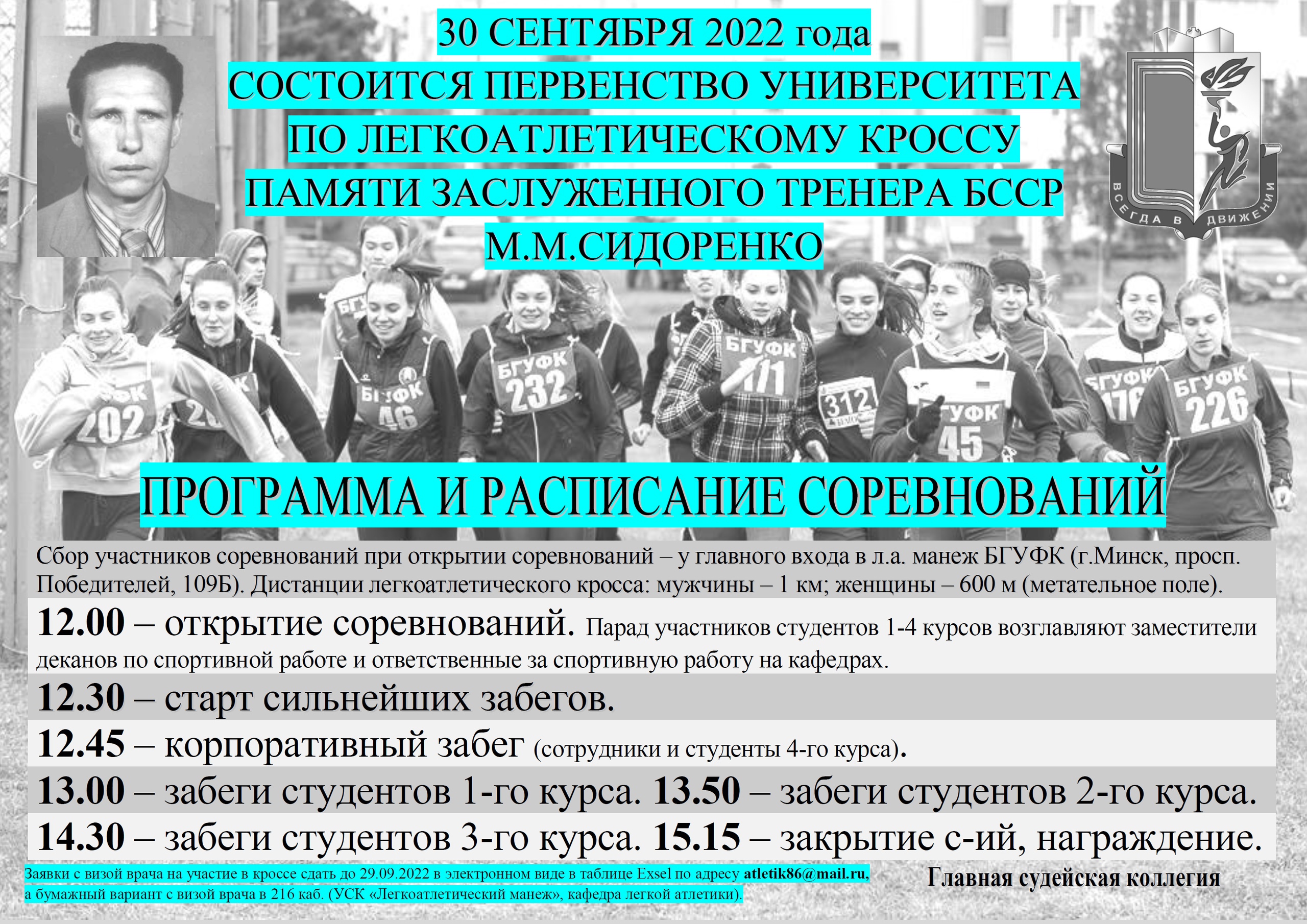 Первенство университета по кроссу памяти М.М.Сидоренко проводится 30 сентября на спортивной базе университета.