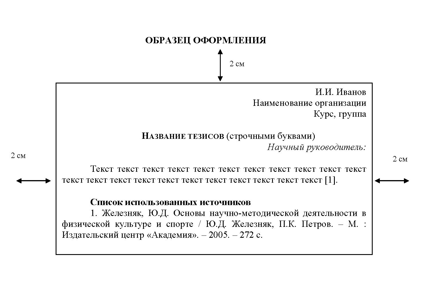 Структура тезисов: Инициалы и фамилии автора(ов) (курсивом, справа), название строчными буквами (полужирно, по центру), научный руководитель, название организации, текст, библиографический список (в соответствии с ГОСТ 7.1-2003) (см. приложение).