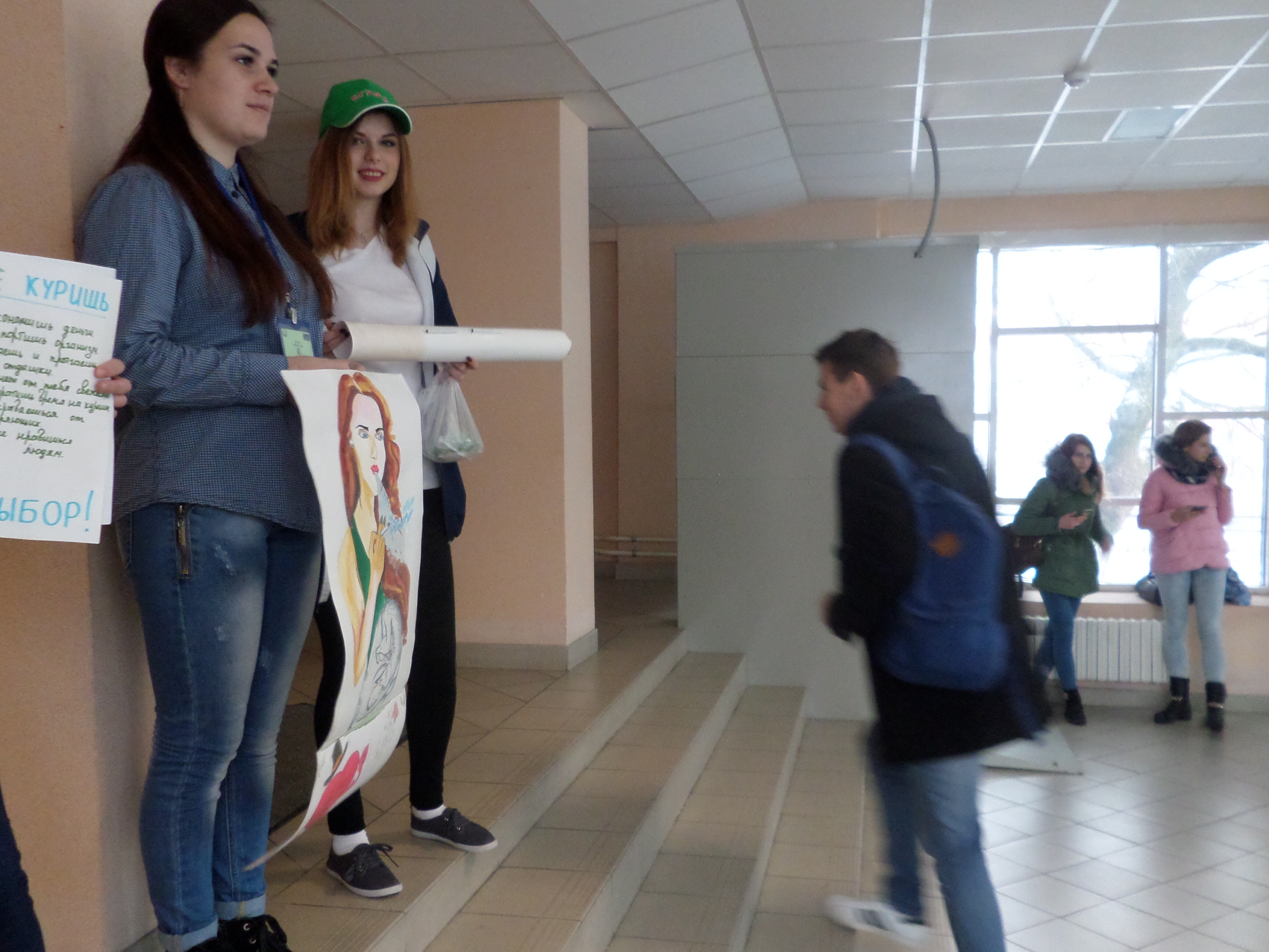 Организаторы мероприятия — студентки факультета оздоровительной физкультуры и туризма Лапезо Елена, Лузанова Анастасия, Осадник Наталия, Брезина Александра, дублёр-воспитатель Дворецкая Ксения, студентка СПФ СИиЕ, задавали вопросы ребятам, разъясняли цель акции. Многие проживающие в общежитии студенты активно и оперативно попрощались с сигаретой. Результат – минус