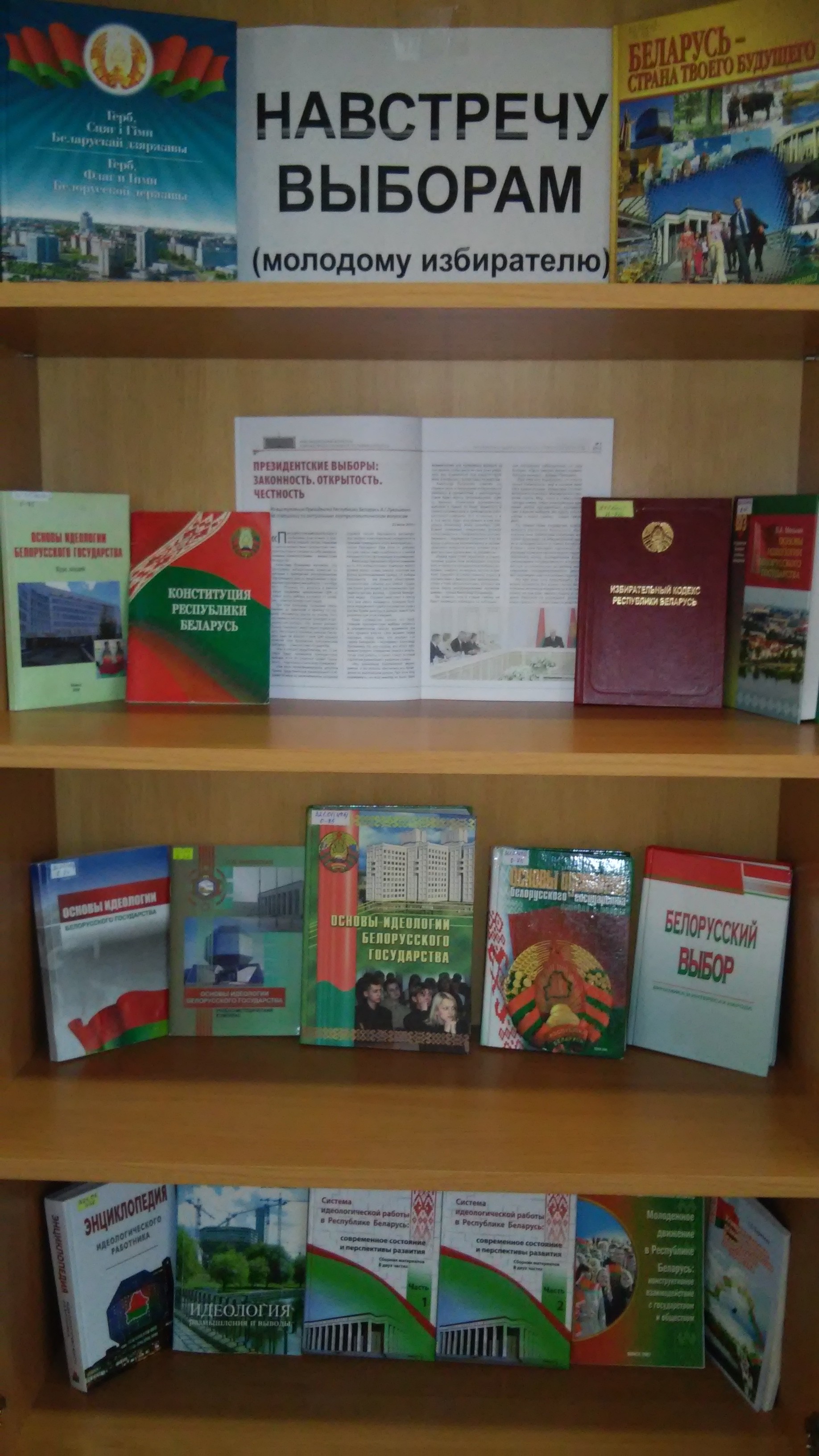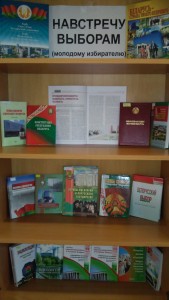 «Уголок молодого избирателя» оформлен в холле университета, в читальном зале библиотеки (ком. 114), в общежитии. Демонстрационные материалы позволяют ознакомиться с Конституцией Республики Беларусь, Избирательным кодексом Республики Беларусь, учебной и методической литературой правового и информационного характера, периодическими изданиями.