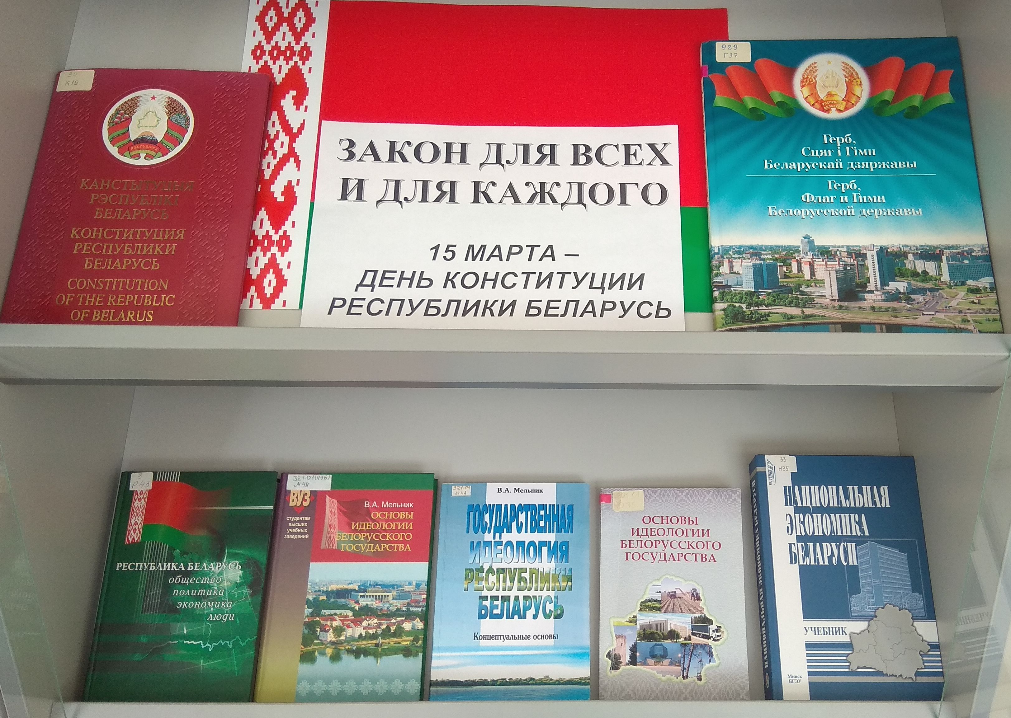 Приглашаем пользователей посетить тематическую выставку «ЗАКОН ДЛЯ ВСЕХ И ДЛЯ КАЖДОГО», организованную в читальном зале (к. 114) ко Дню Конституции Республики Беларусь.