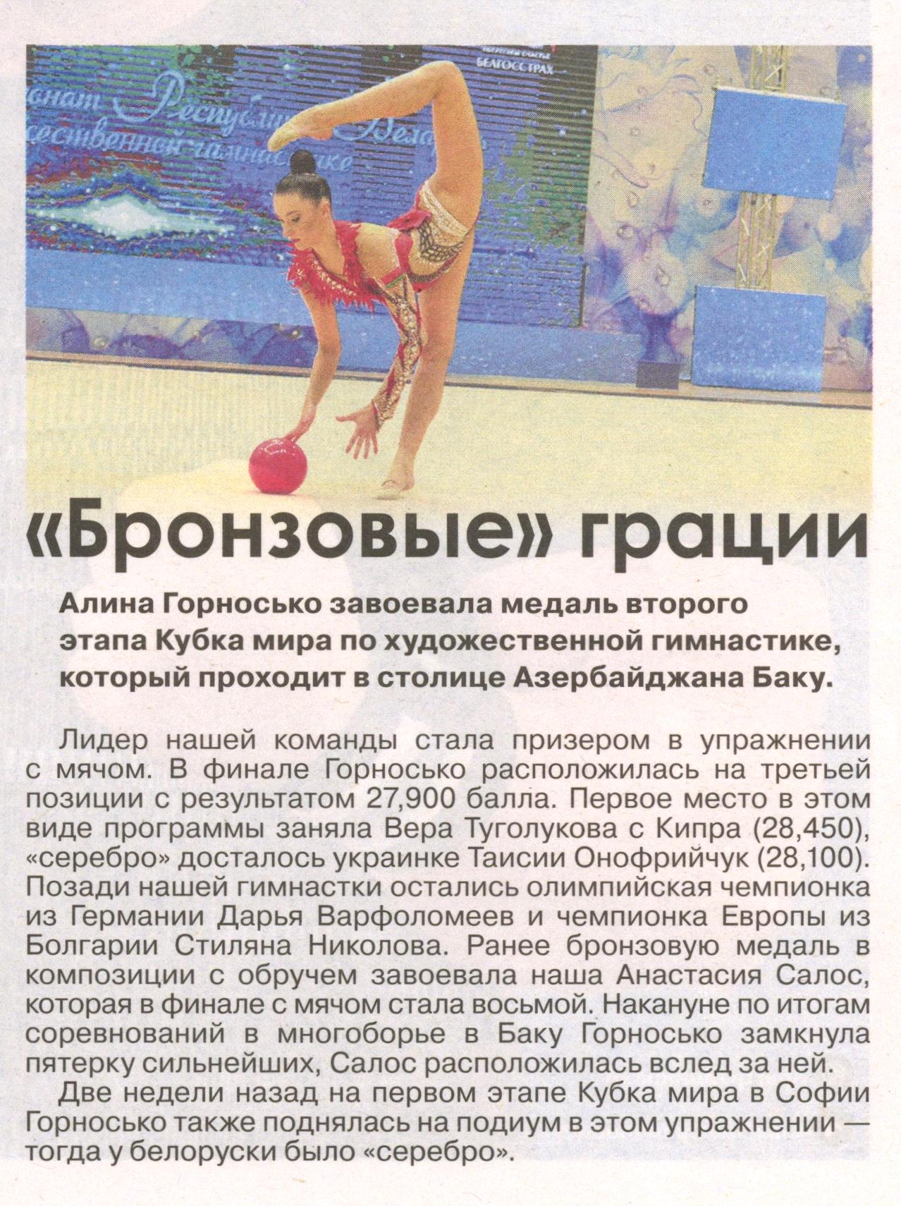 На этапе Кубка мира по художественной гимнастике в Баку Алина Горносько и Анастасия Салос (студентка БГУФК) завоевали бронзовые медали.