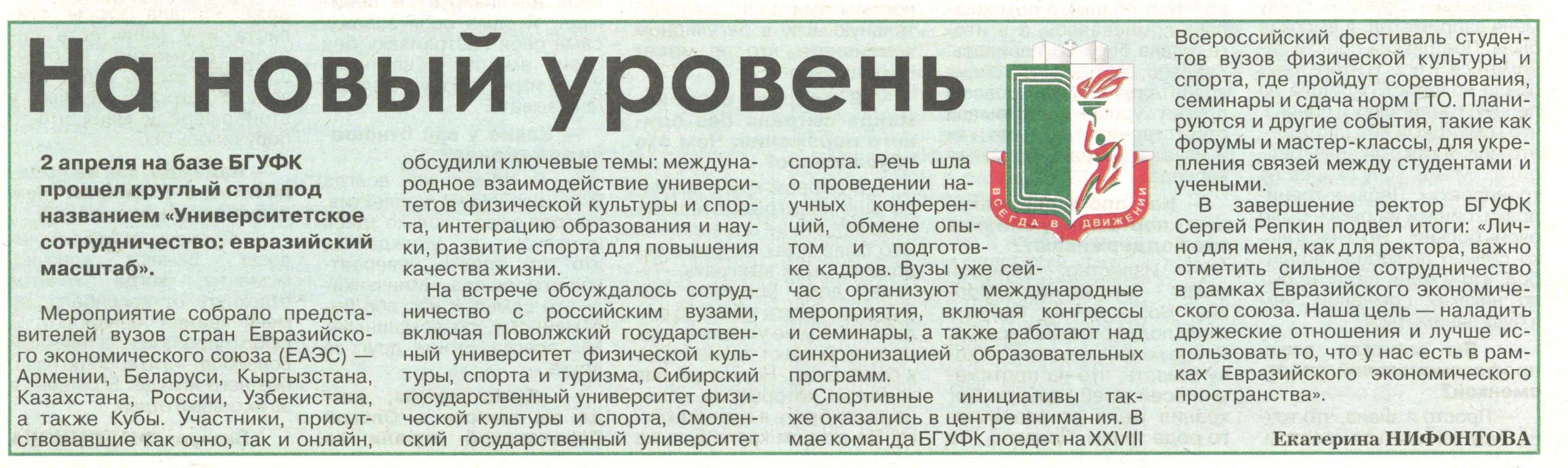 О работе круглого стола «Университетское сотрудничество: евразийский масштаб», который был организован на базе БГУФК. На данном мероприятии обсуждались вопросы международного взаимодействия университетов физической культуры и спорта, интеграции образования и науки, развития спорта для повышения качества жизни.