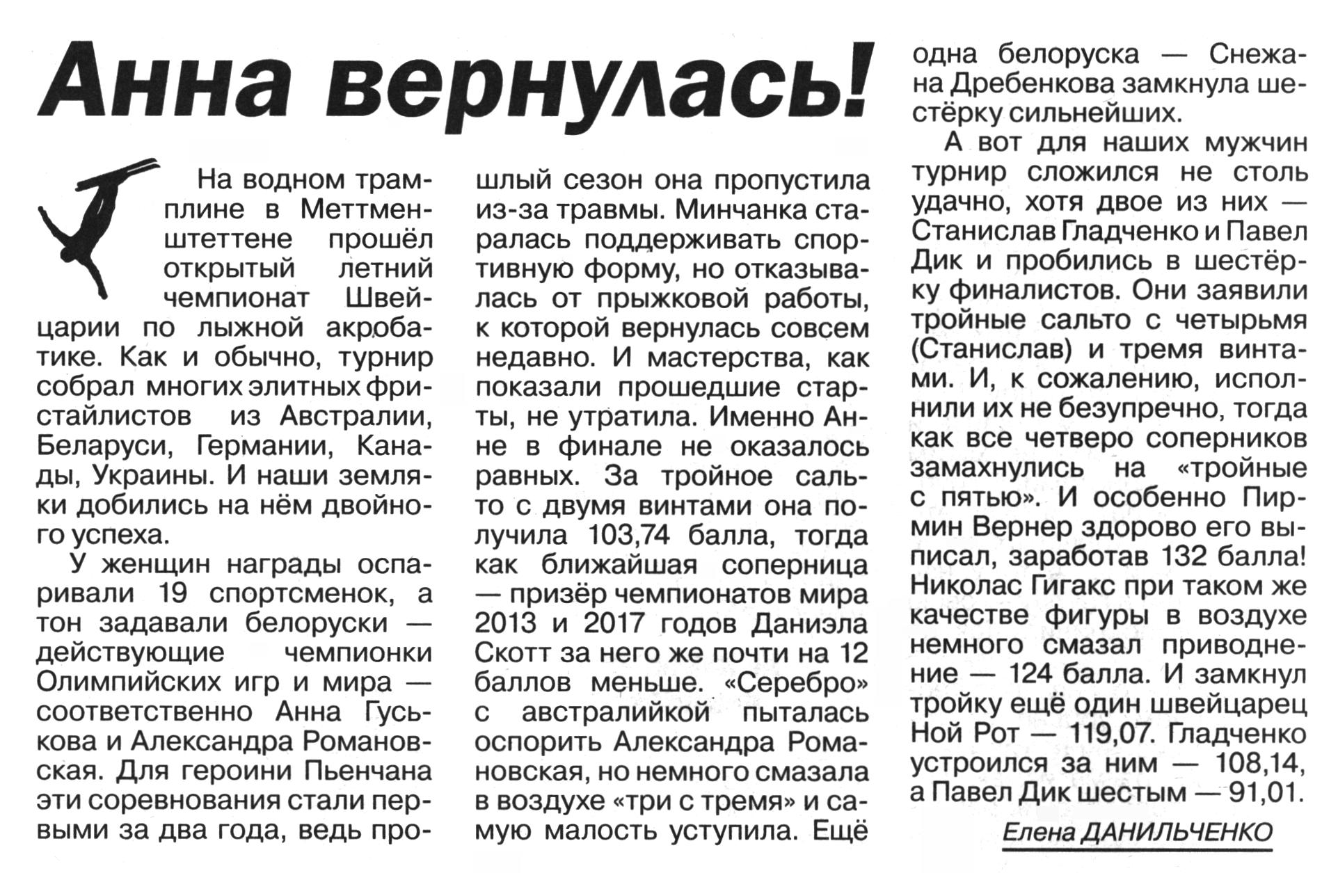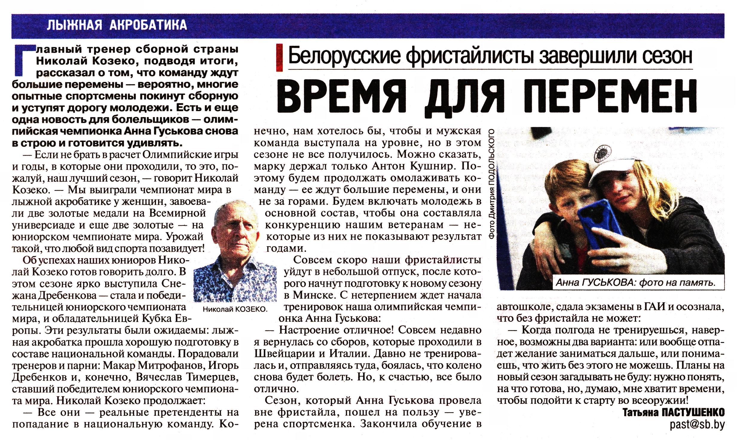 Интервью с главным тренером сборной Беларуси по лыжной акробатике Николаем Козеко о предстоящих стартах Кубка мира-2018/2019 в Солт-Лейк-Сити. Далее Н. Козеко сообщил, что Станислав Гладченко, Алла Цупер и Анна Гуськова (студентка БГУФК) пропускают начало сезона. К этапу готовятся шесть фристайлистов: А. Романовская, А. Кушнир, М. Густик, М. Густик, Д. Мазуркевич и студенты БГУФК Артем Башлаков и Павел Дик.