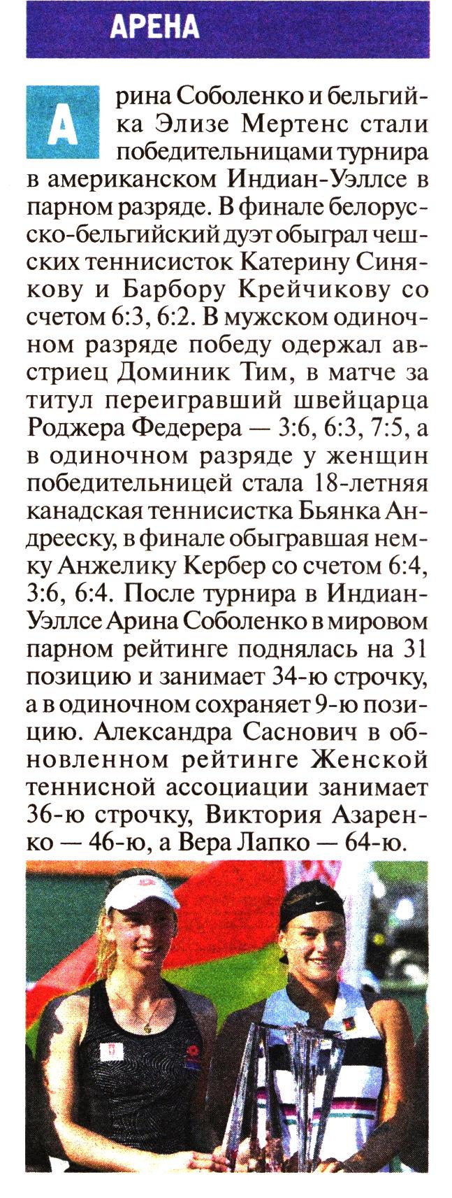 Беседа с капитаном сборной по теннису Татьяной Пучек, в которой она назвала состав команды, определила шансы в матчах Кубка Федерации, отметила лидера команды — Арину Соболенко (студентка БГУФК), занявшей впервые в карьере девятую строчку мирового рейтинга.
