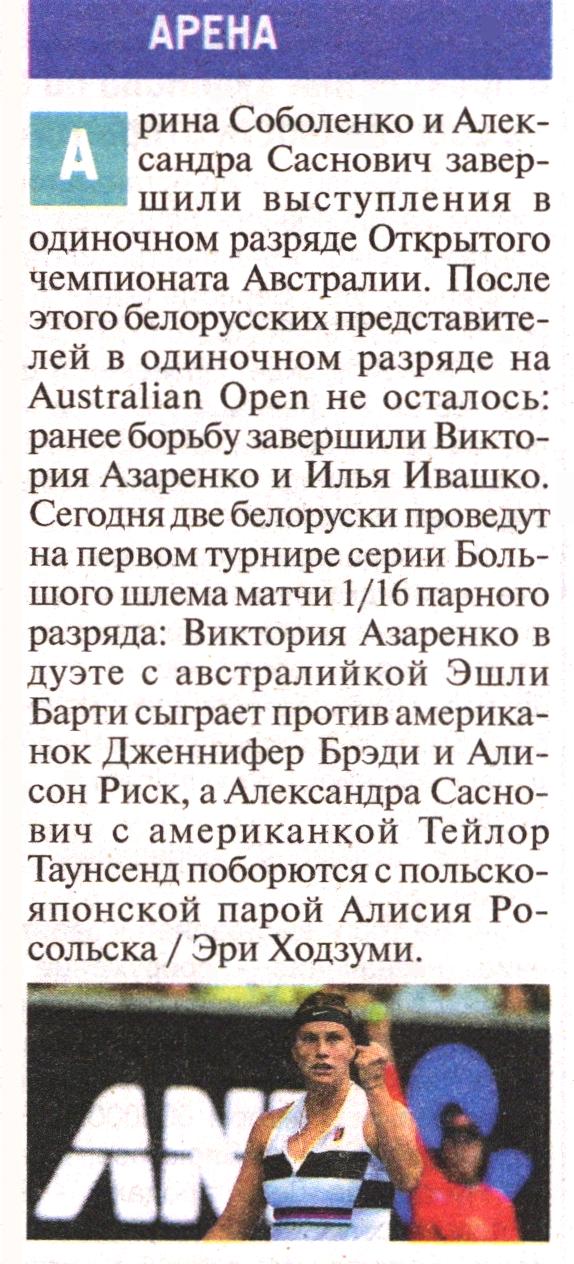 Арина Соболенко и Александра Саснович завершили выступления в одиночном разряде Открытого чемпионата Австралии.