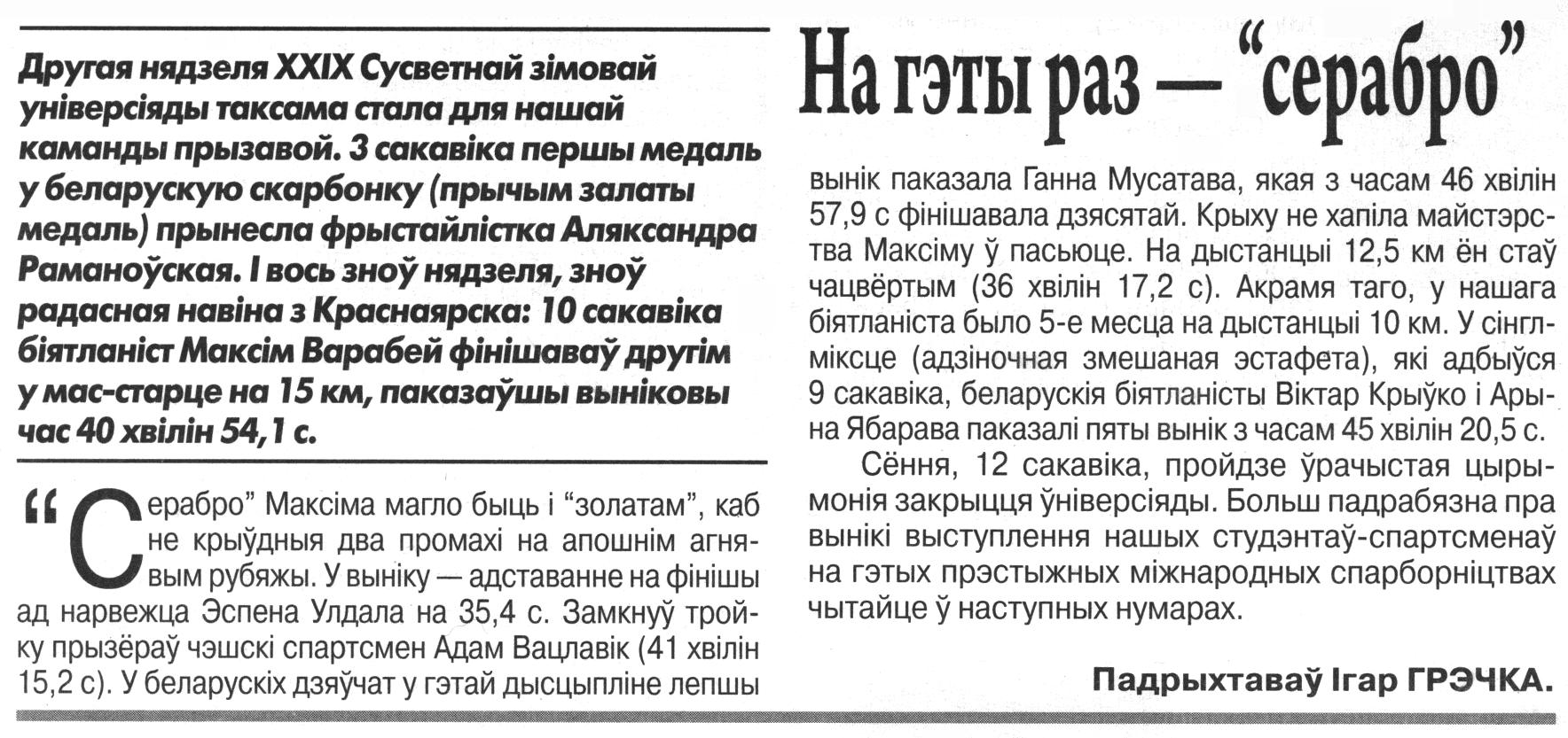 Министерство спорта и туризма провело в Веснянке зимнюю спартакиаду. В биатлонной эстафете 4×1,2 км первое место завоевала команда Белорусского государственного университета физической культуры: Евгений Федосов, Максим Воропай, Юлия Кузьмич и Владимир Клинов.