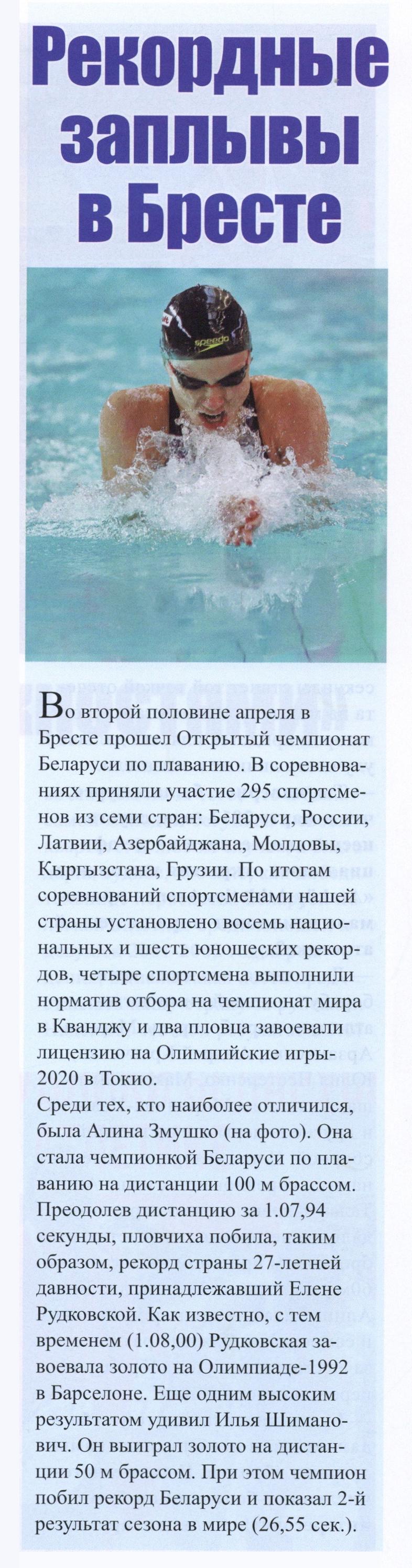 В Бресте на Открытом чемпионате Беларуси по плаванию на короткой воде Алина Змушко (студентка БГУФК) установила три национальных рекорда и выполнила норматив для участия в чемпионате Европы-2019.