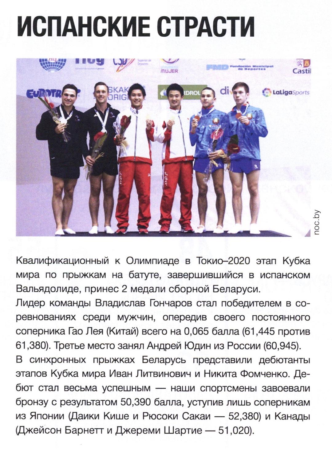 На этапе Кубка мира по прыжкам на батуте в Испании Владислав Гончаров завоевал золотую медаль в индивидуальных прыжках, в синхронных прыжках бронзовую награду завоевали Иван Литвинович и Никита Фомченко.