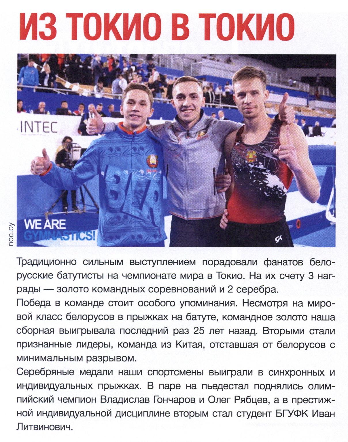 На чемпионате мира по прыжкам на батуте в Токио Владислав Гончаров и Олег Рябцев завоевали серебряную награду в синхронных прыжках, Иван Литвинович (студент БГУФК) завоевал серебряную медаль в индивидуальных прыжках, Владислав Гончаров, Иван Литвинович (студент БГУФК) и Олег Рябцев выиграли золотую медаль в командных соревнованиях.