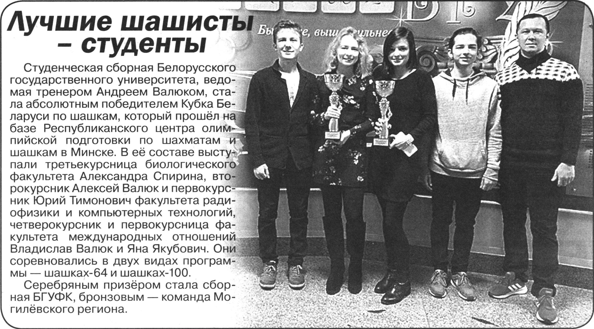 Студенческая сборная Белорусского государственного университета стала победителем Кубка Беларуси по шашкам, серебряным призером стала сборная БГУФК.