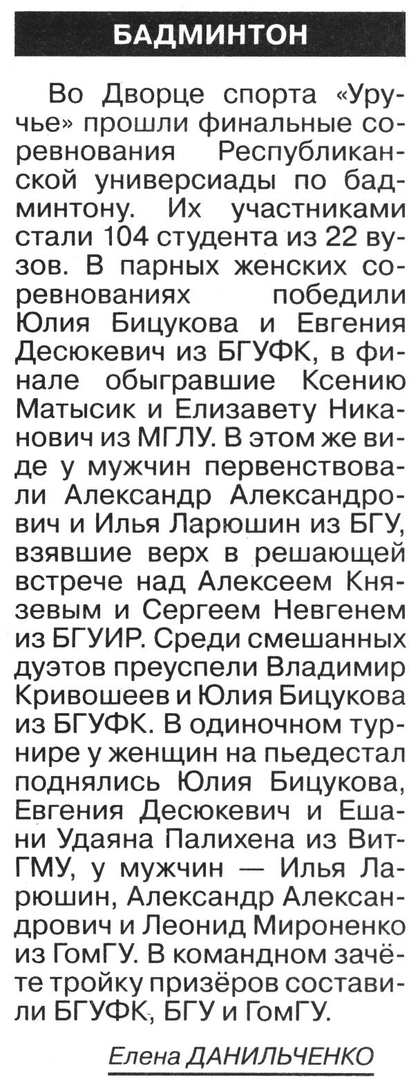 Подведены итоги Республиканской универсиады по бадминтону. Успешно выступили студенты БГУФК.