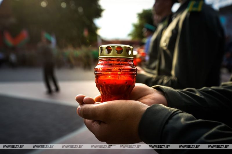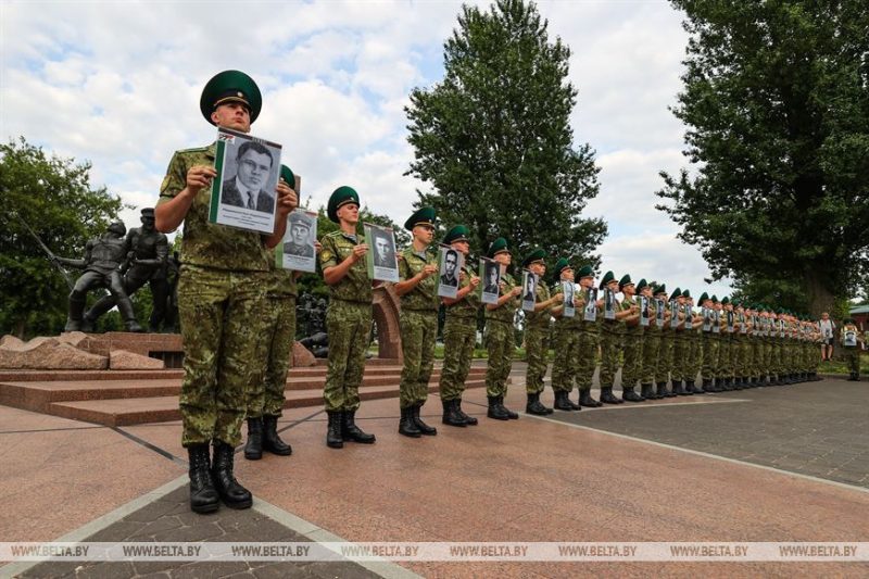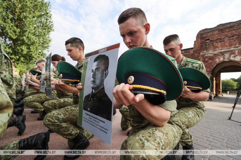 Во время мероприятия курсанты выстраиваются с портретами погибших в первых боях Великой Отечественной войны защитников Белорусского пограничного округа.