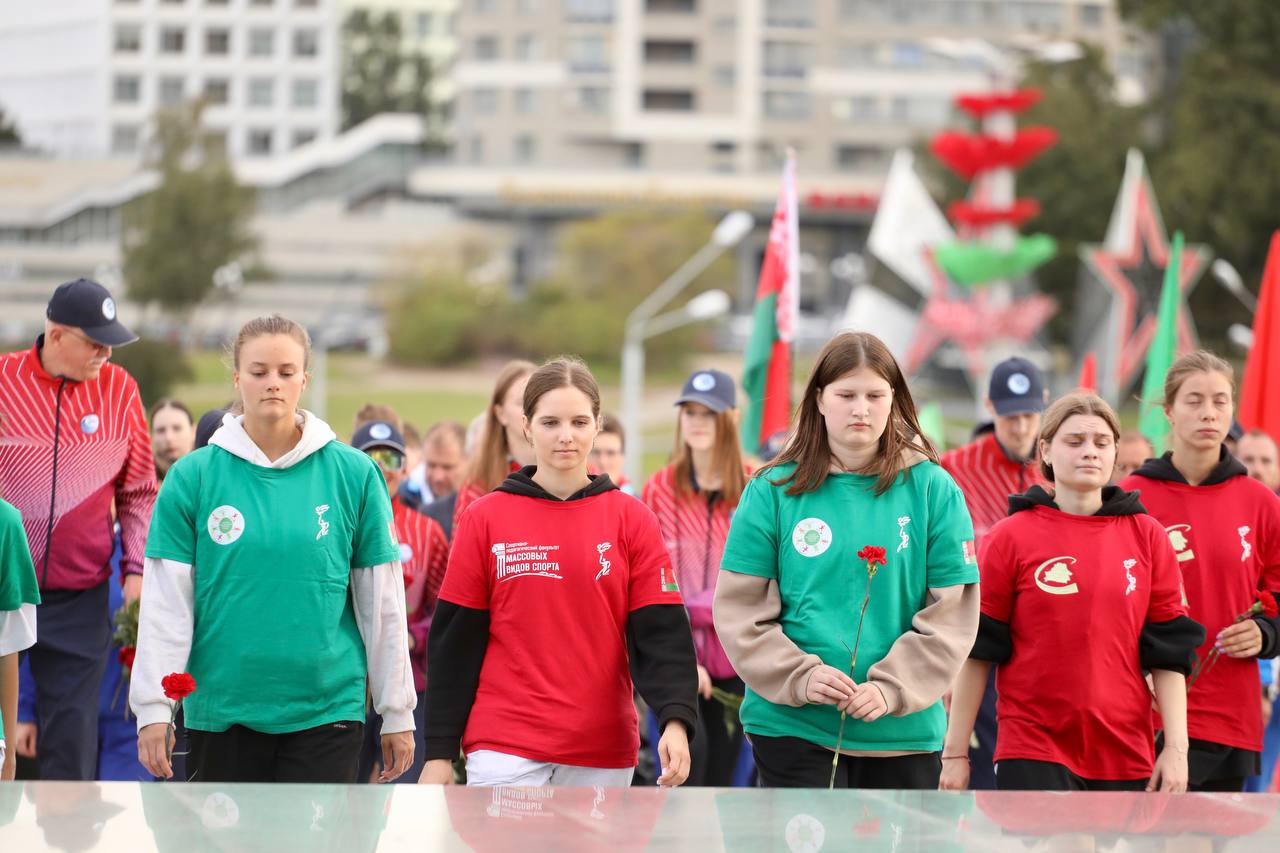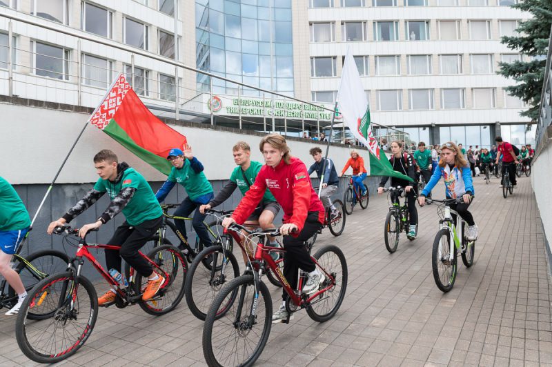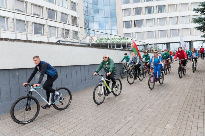 Традиционно стартовал велопробег от БГУФК — аквапарк «Лебяжий» и заканчивался у стелы «Минск – город-герой», где все участники возложили цветы к монументу.