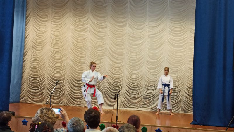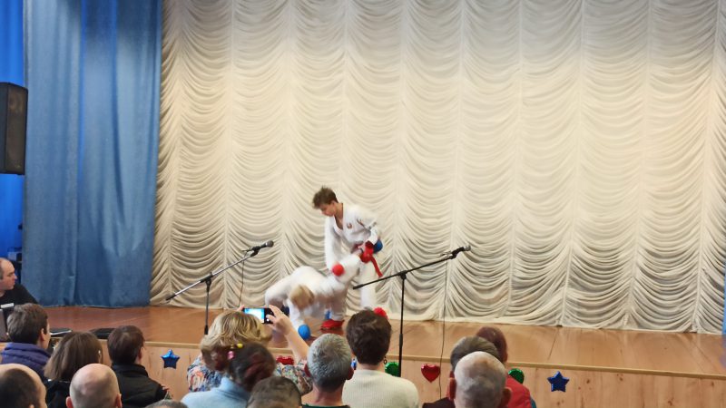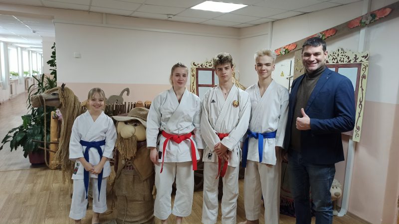 Директор высшей школы тренеров А.С. Краевич, преподаватели университета и их воспитанники привезли не только подарки дому-интернату, но и организовали показательные выступления по карате и художественной гимнастике.