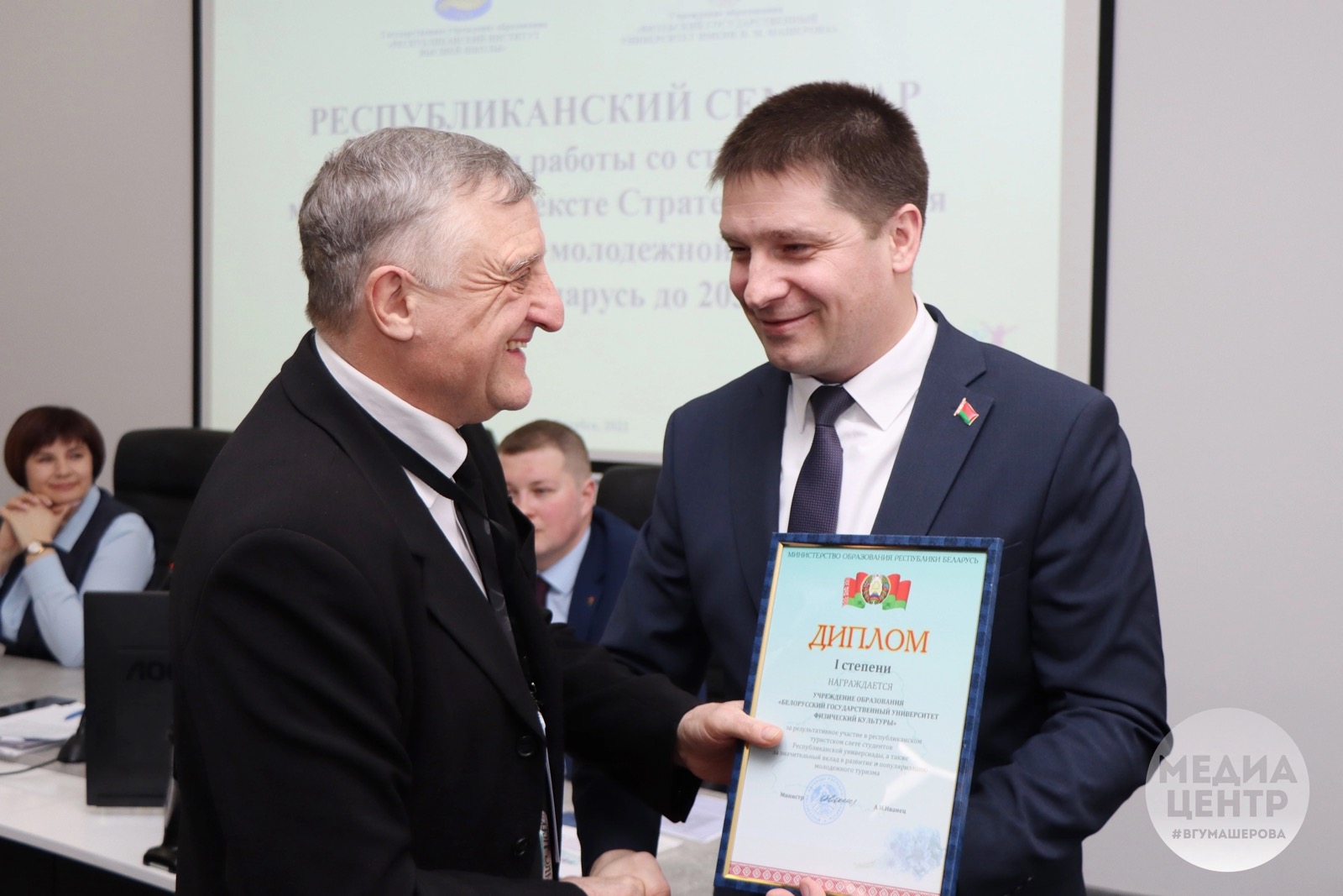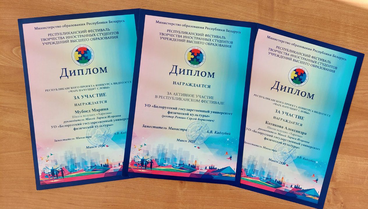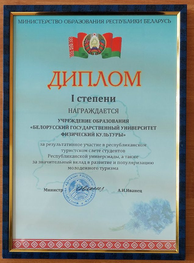 Учреждение образования «Белорусский государственный университет физической культуры» награжден дипломом I степени Министерством образования Республики Беларусь за результативное участие в республиканском туристском слете студентов Республиканской универсиады, а также за значительный вклад в развитие и популяризацию молодежного туризма. За активное участие в Республиканском фестивале творчества иностранных студентов учреждений высшего образования награждены студенты университета Котикова Александра и Мубоед Марина.