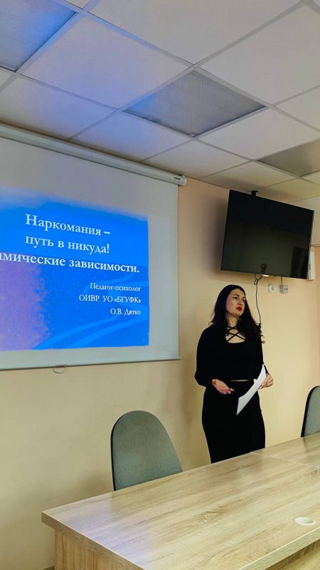 Педагог-психолог отдела идеологической и воспитательной работы Ольга Владимировна Дятко в своем выступлении обратила внимание присутствующих на проблемы психической зависимости от наркотиков и химических веществ.