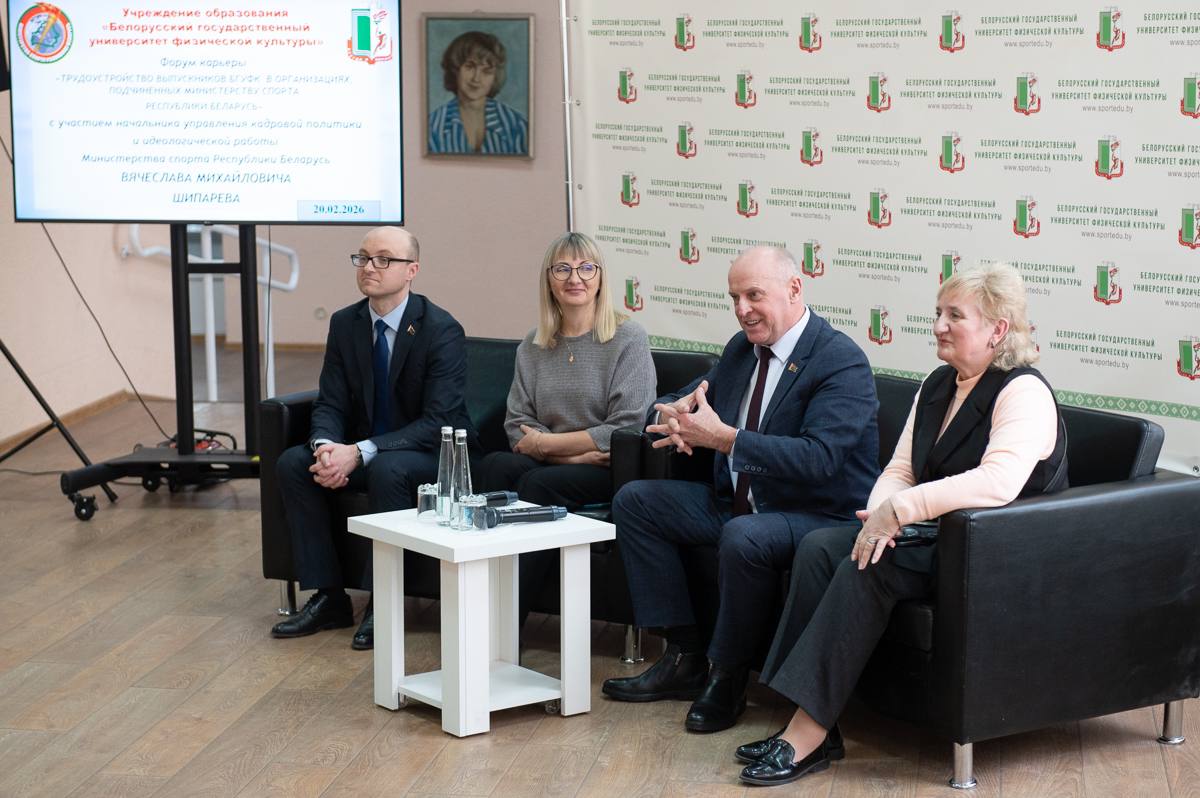 20 февраля в холле актового зала состоялся форум карьеры «Трудоустройство выпускников БГУФК в организациях, подчиненных Министерству спорта Республики Беларусь». В мероприятии принял участие начальник управления кадровой политики и идеологической работы Министерства спорта Республики Беларусь Вячеслав Михайлович Шипарев.