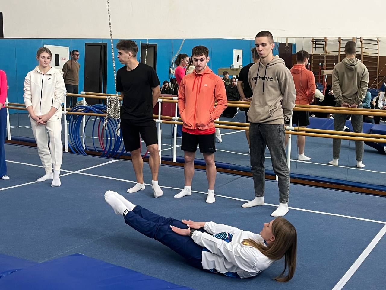В первый день, 17 декабря в рамках мастер-класса «Совершенствование пространственно-временных характеристик движения в гимнастических и танцевальных видах спорта», проведенного студенткой четвертого курса кафедры гимнастики Монастырской Ангелиной Владимировной, участникам семинара были продемонстрированы специальные упражнения для совершенствования координационных способностей.