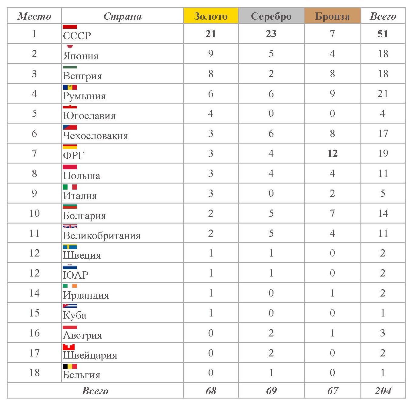 На соревнованиях в Болгарии советская команда не оставила конкурентам ни единого шанса, получив 21 золотую медаль и заняв первое место в общекомандном зачёте. С той поры место ниже первого в СССР уже не расценивалось как успех.