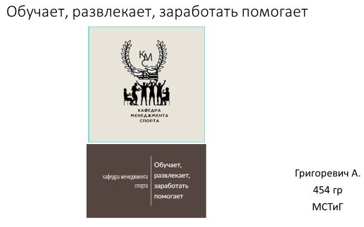 - Адекватное Значение (актуальность) – логотип и слоган создают верный, предсказуемый, имидж и представление о направлениях деятельности кафедры менеджмента спорта;