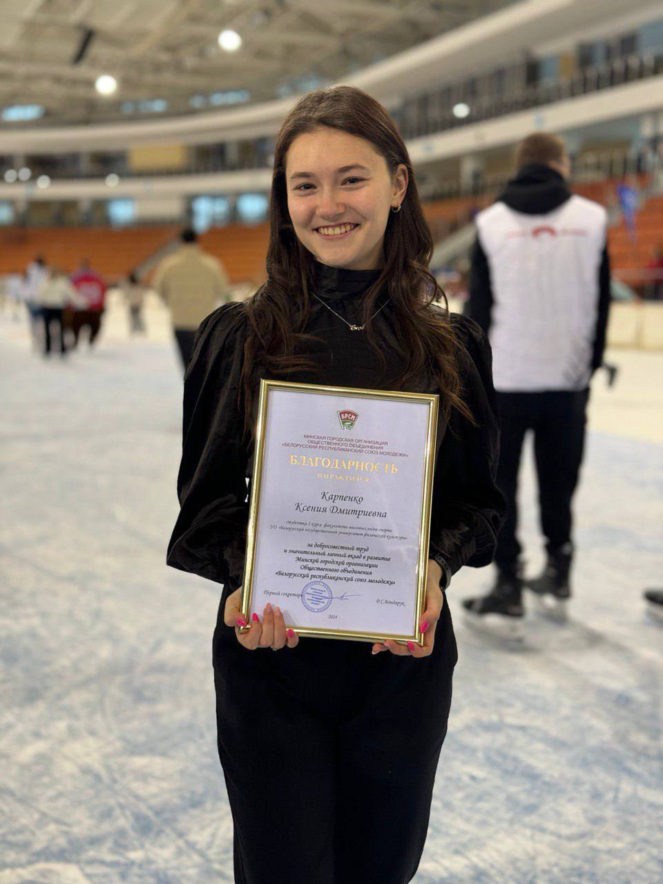 Студент 222 группы Карпенко Ксения Дмитриевна приняла участие в «Ледовом вечере» который был посвящен Единому дню голосования и была удостоена Благодарности за добросовестный труд и значительный вклад в развитие Минской городской организации Общественного объединения «Белорусский республиканский союз молодежи».
