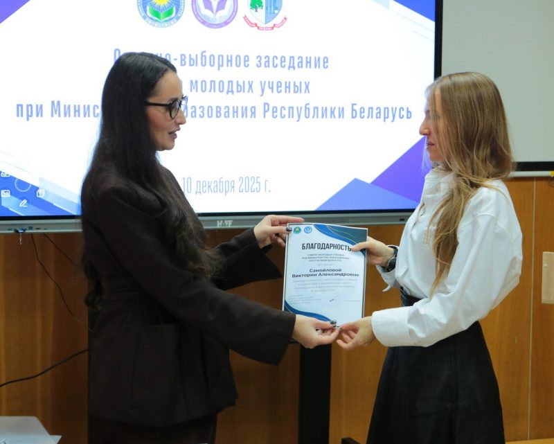 10.12.2025 доценту кафедры Самойловой Виктории Александровне была вручена благодарность Совета молодых ученых при Министерстве образования Республики Беларусь за вклад в развитие Совета молодых ученых и содействие развитию научной и инновационной деятельности молодежи. Награда является признанием активной научно-организационной деятельности, участия в реализации инициатив, направленных на поддержку молодых исследователей, а также вклада в развитие научного потенциала Республики Беларусь.
