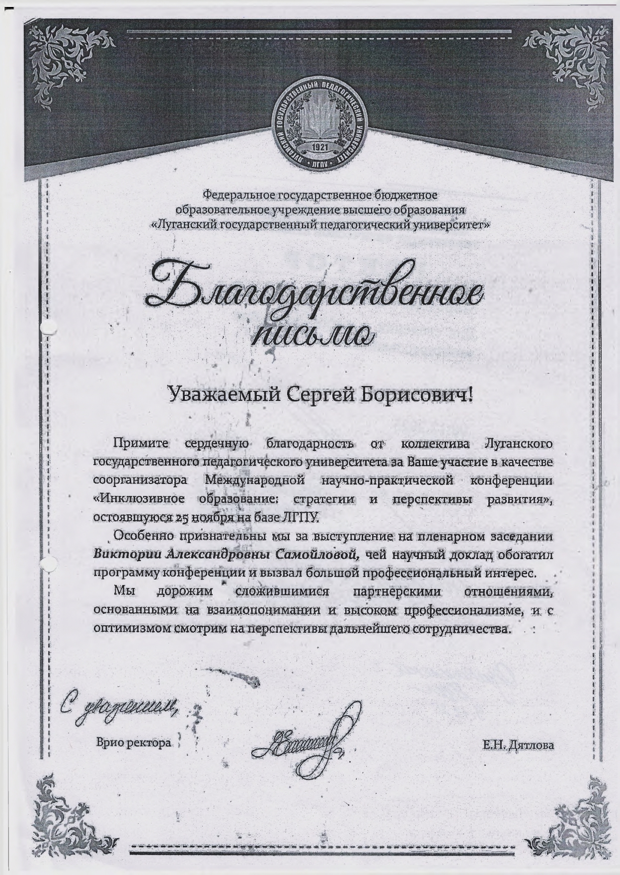 25.11.2025 доцент Самойлова В.А. выступила на пленарном заседании Международной научно-практической конференции «Инклюзивное образование: стратегии и перспективы развития» (25.11.2025, Федеральное государственное бюджетное образовательное учреждение высшего образования «Луганский государственный педагогический университет», г.Луганск), в связи с чем получено благодарственное письмо на имя ректора БГУФК.