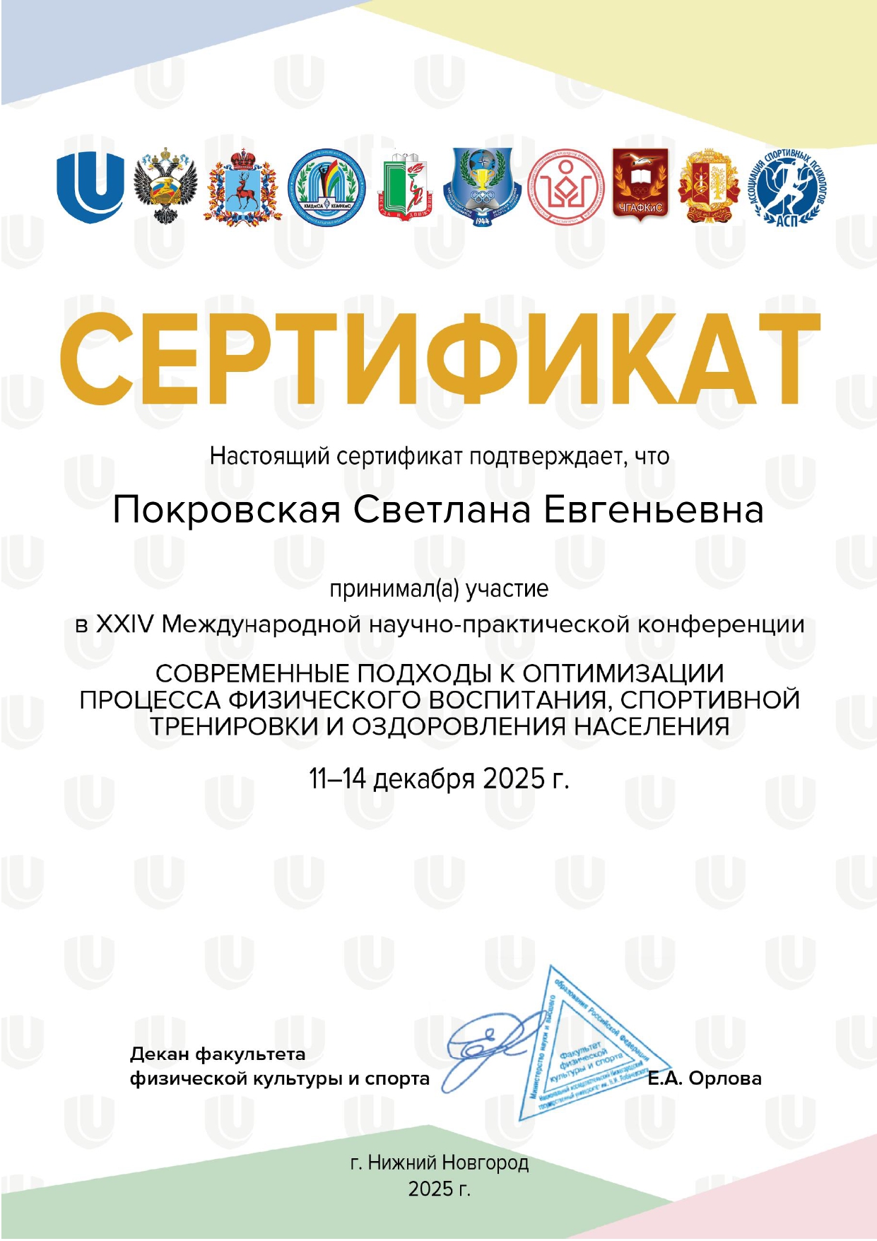 11-12 декабря 2025 года в Нижегородском государственном университета им. Н.И. Лобачевского состоялась XXIV Международная научно-практическая конференция «Современнные подходы к оптимизации процесса физического воспитания, спортивной тренировки и оздоровления населения». Ежегодно кафедра психологии БГУФК принимает участие в работе Международной научно-практическаой конференции.