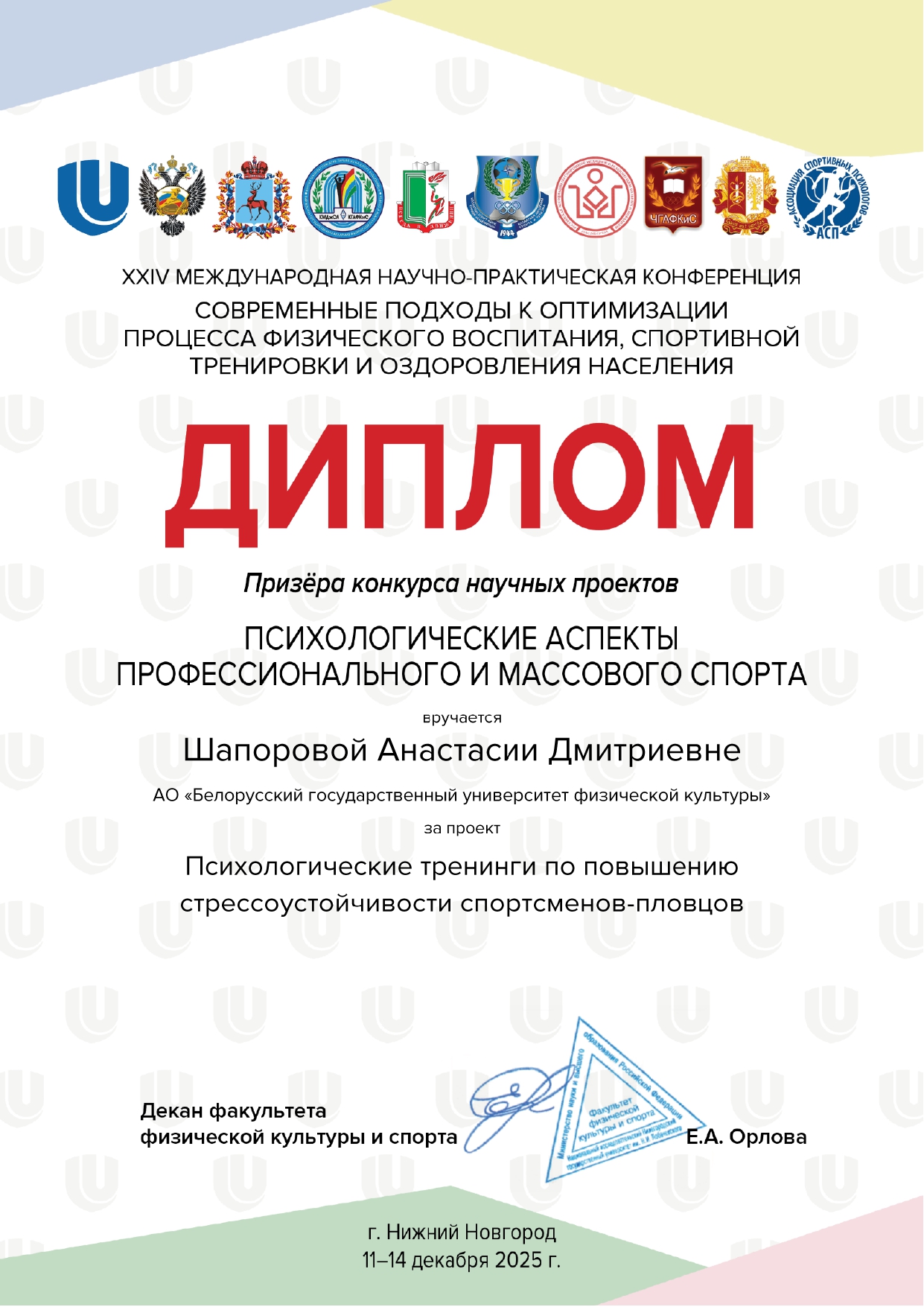 11 декабря 2025 года в конкурсе научных студенческих проектов «Психологические аспекты профессионального и массового спорта» приняла участие магистрант кафедры психологии Шапорова Аастасия Дмитриевна с проектом «Психологические тренинги по повышению стрессоустойчивости спортсменов-пловцов» (2 место).