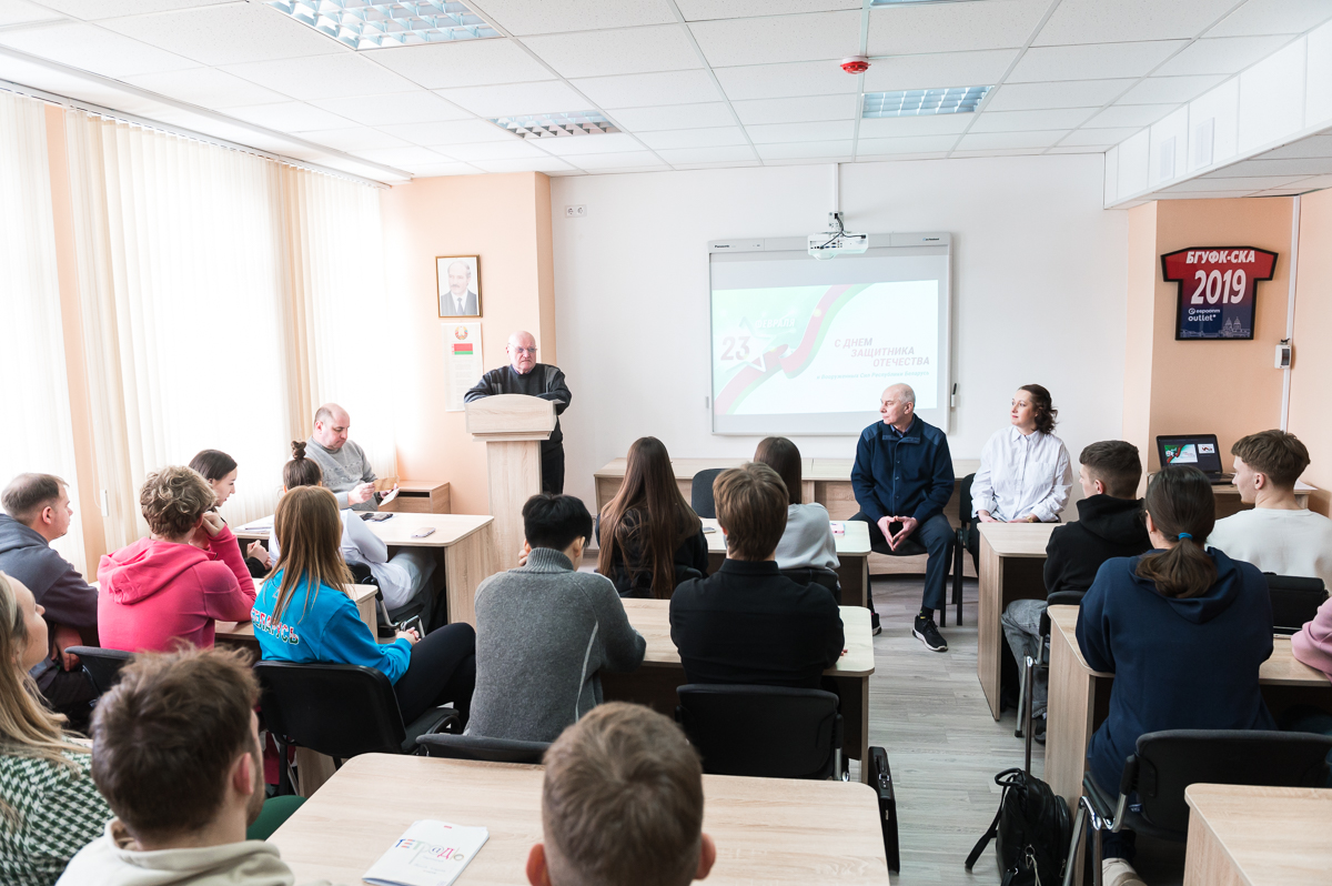 В преддверии празднования Дня защитника Отечества и Вооруженных Сил Республики Беларусь на кафедре спортивных игр прошла поэтическая встреча «Есть такая профессия — Родину защищать» для студентов и кураторов кафедры с председателем ветеранской организации УО «БГУФК», председателем ревизионной комиссии БОО «ВФКиС» Жовнером Дмитрием Петровичем.
