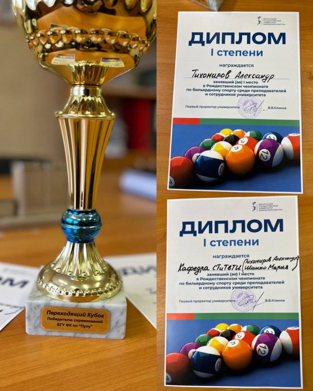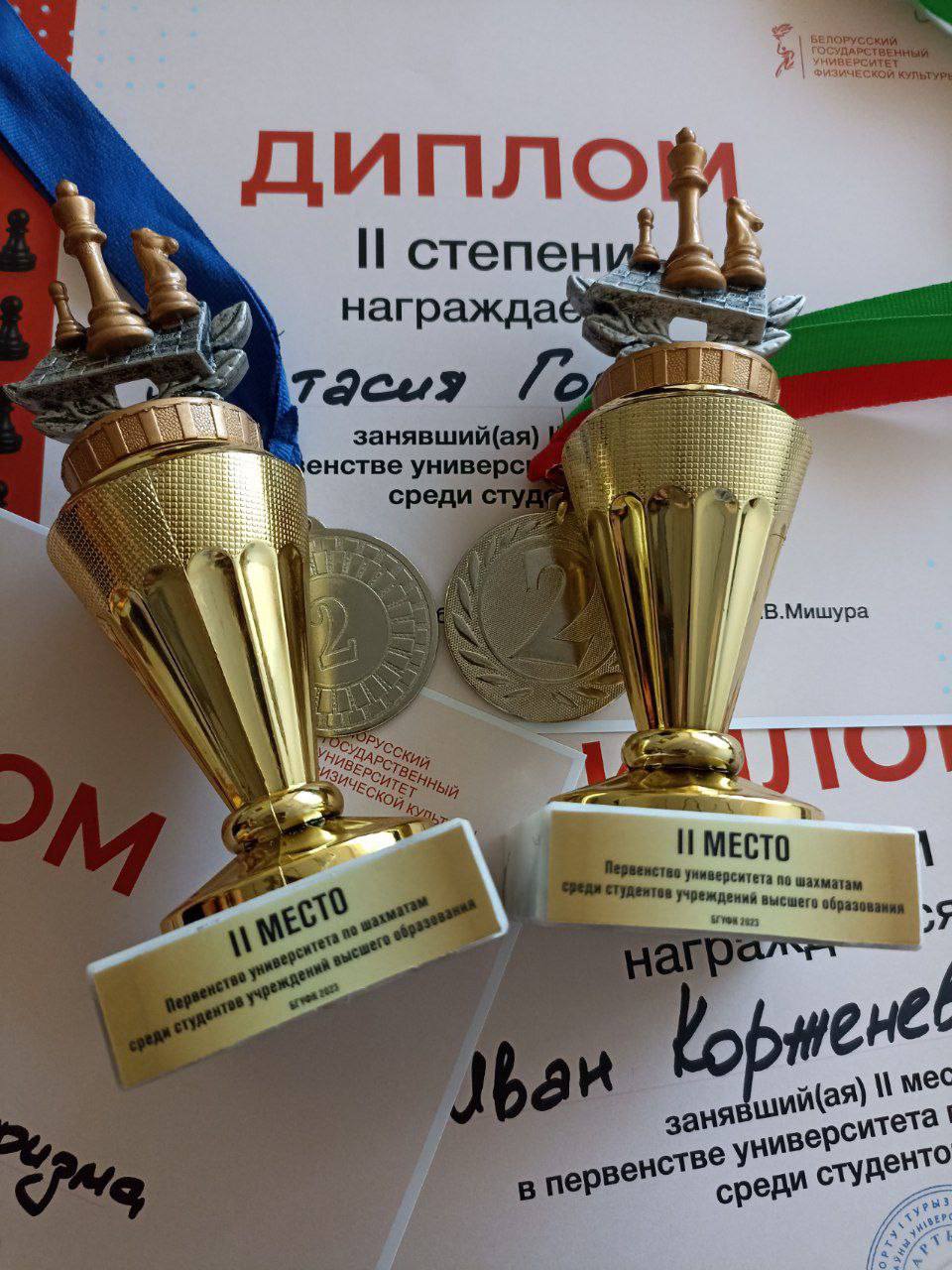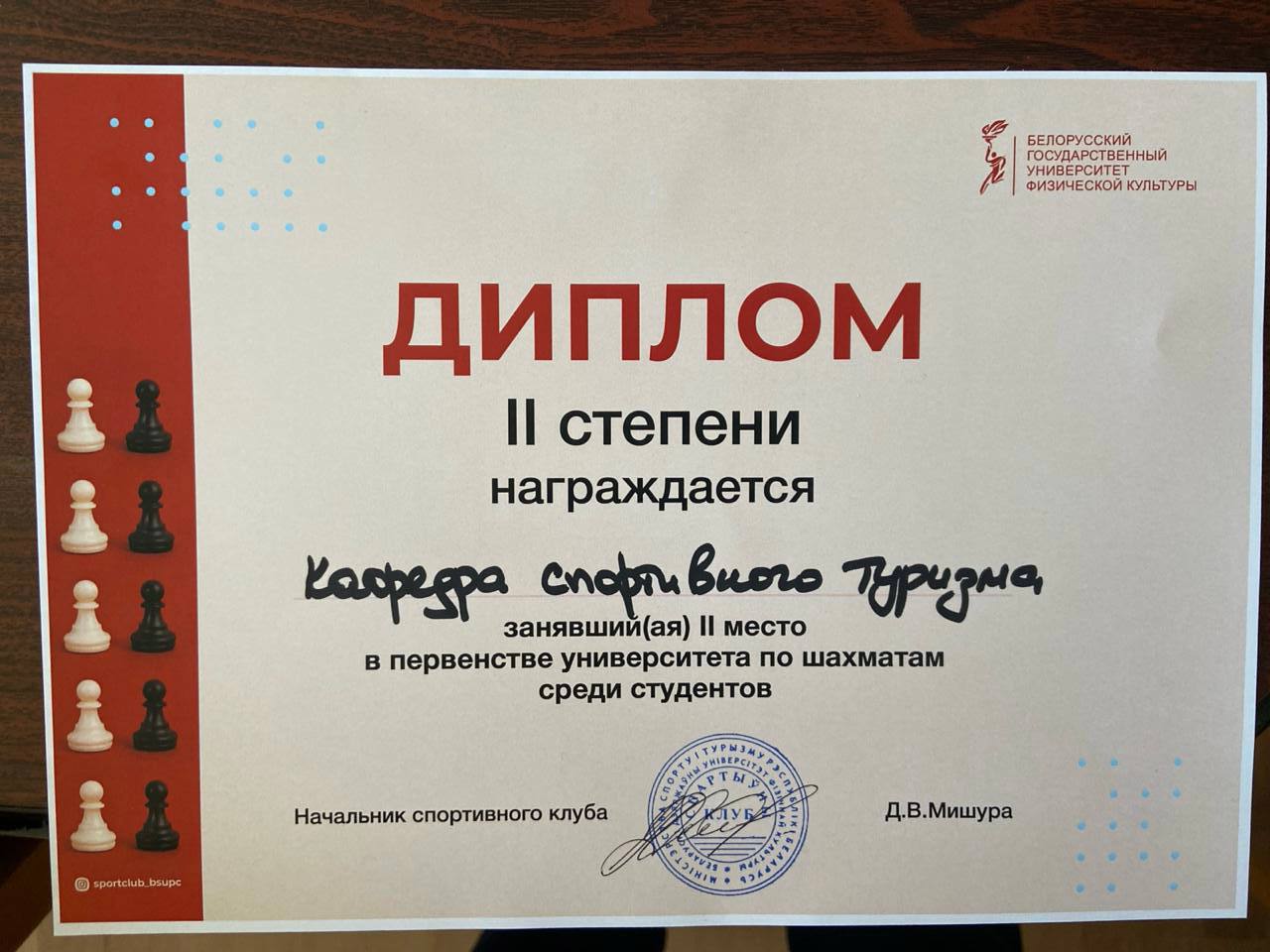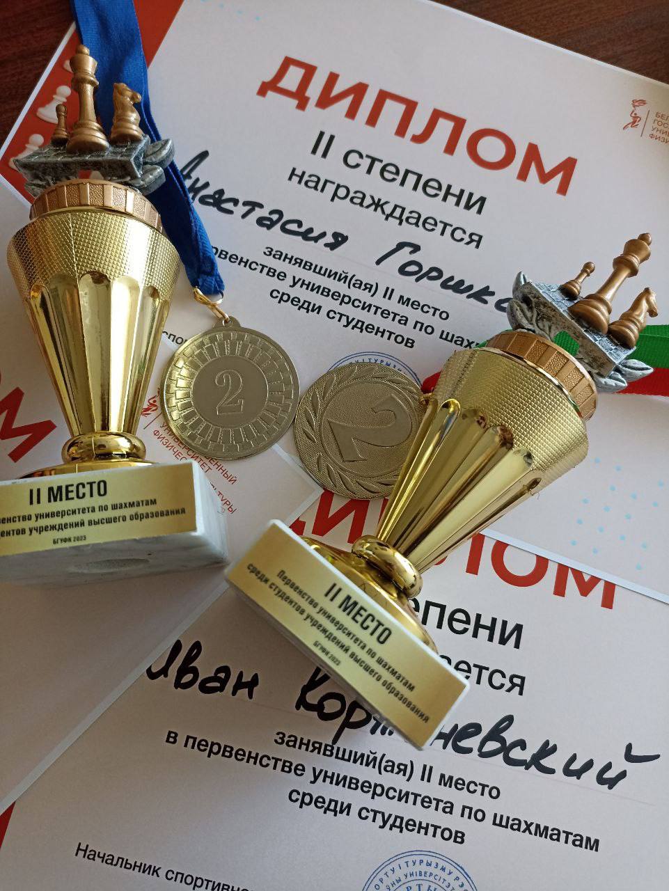 2 ноября 2023 г. студенты кафедры спортивного туризма и технологий в туристической индустрии ИМСиТ Корженевский Иван 426 гр. и Горшкова Анастасия 436 гр. заняли второе место на Первенстве университета по шахматам среди студентов.
