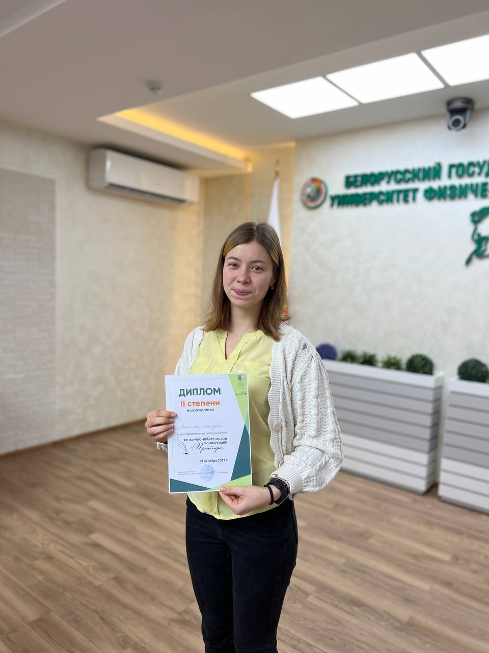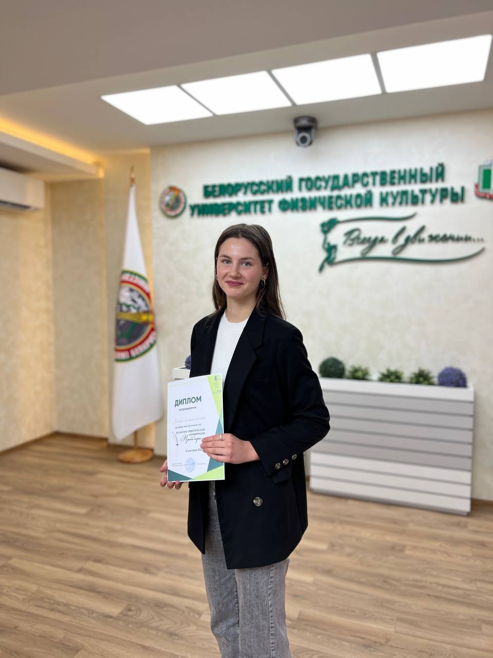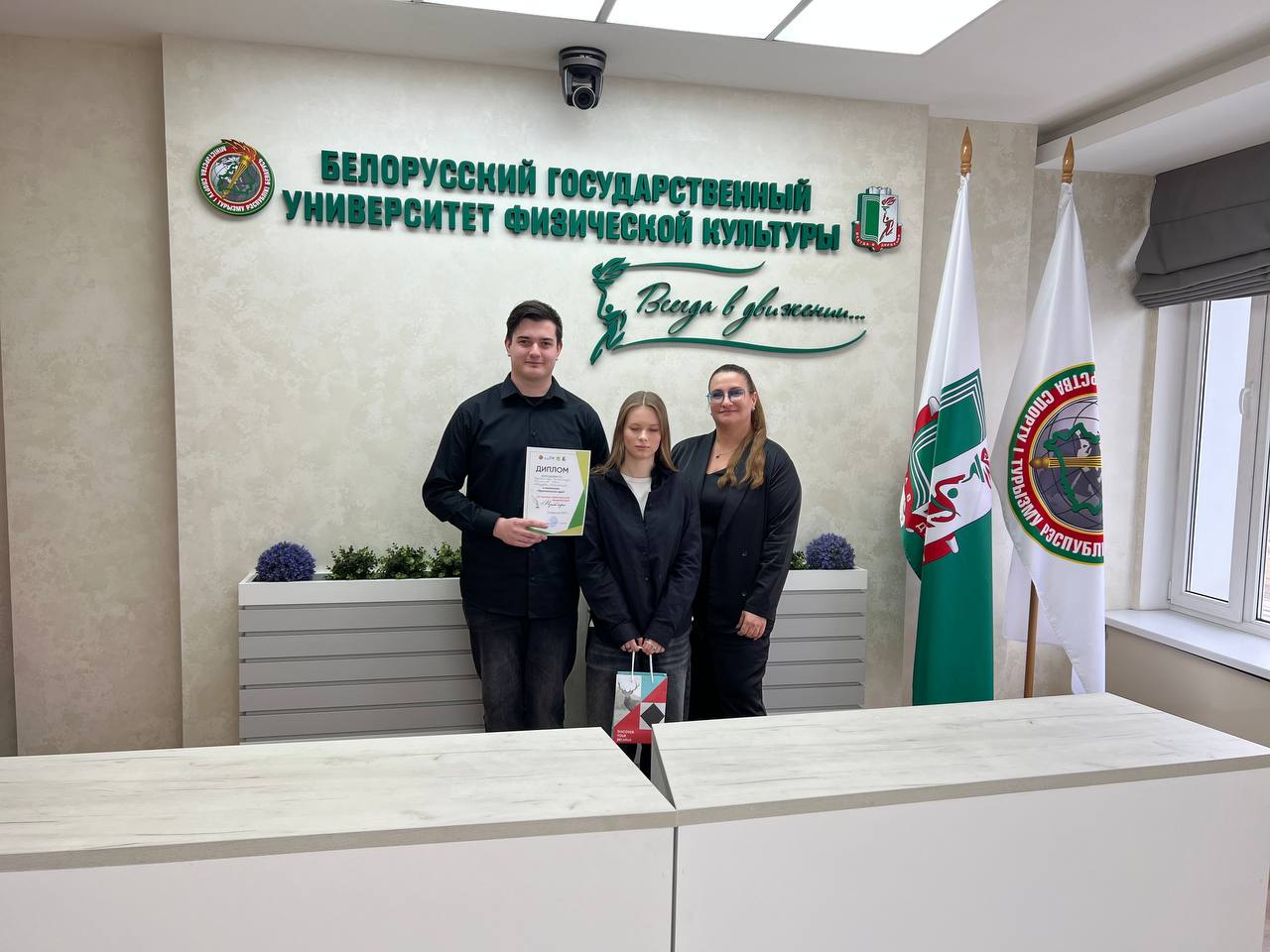 Диплом 3-ей степени получила Мазурова Дарья (411 группа). Тема «Перспективы развития конного спорта в Республике Беларусь». Научный руководитель – Игнатьева Т.Н. доцент кафедрой спортивного туризма и технологий в туристической индустрии, кандидат медицинских наук, доцент.