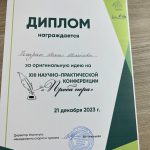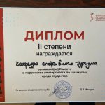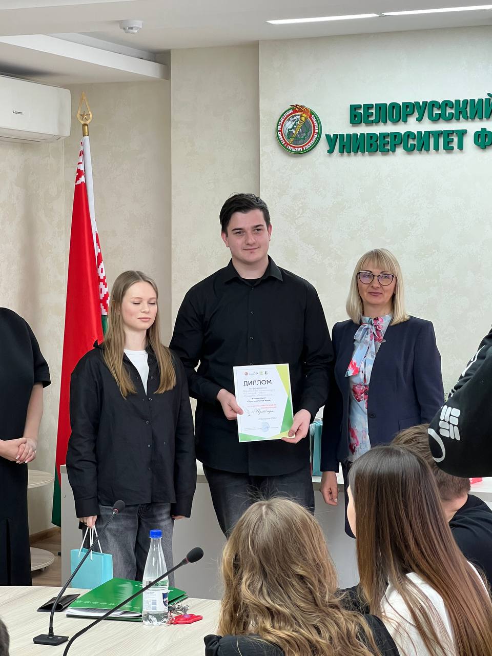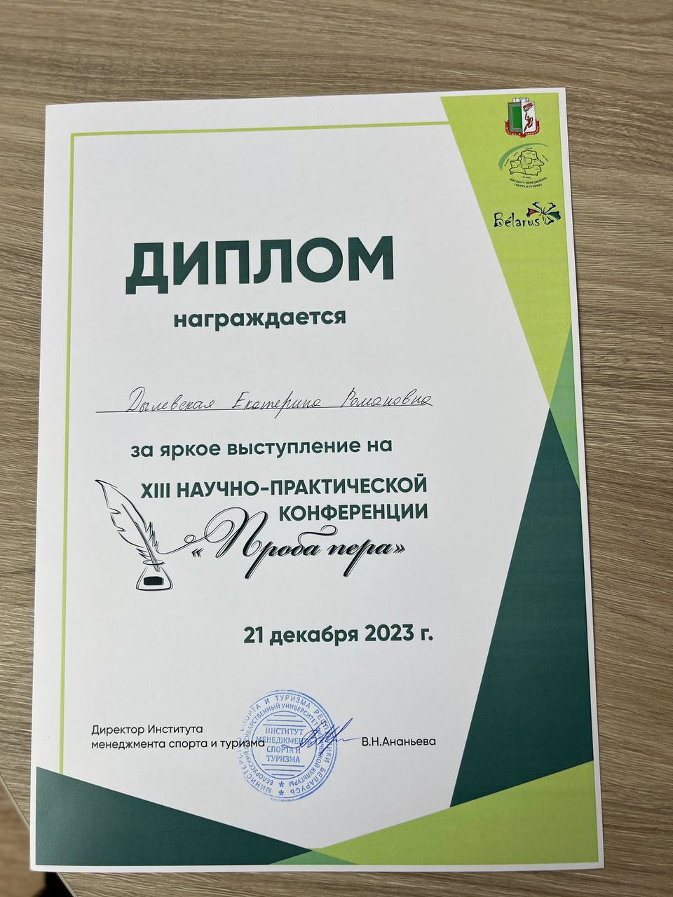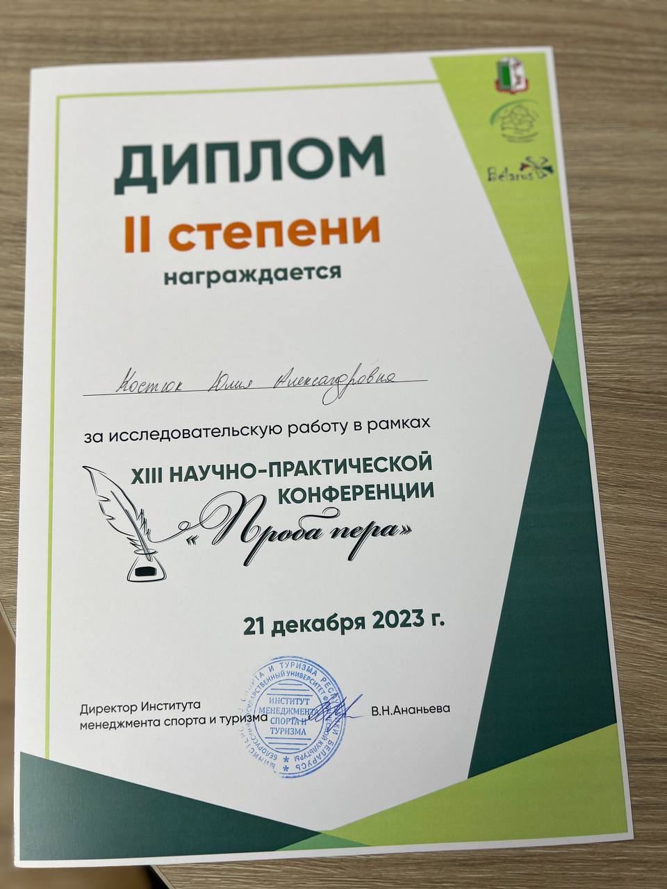 Диплом 3-ей степени получила Мазурова Дарья (411 группа). Тема «Перспективы развития конного спорта в Республике Беларусь». Научный руководитель – Игнатьева Т.Н. доцент кафедрой спортивного туризма и технологий в туристической индустрии, кандидат медицинских наук, доцент.