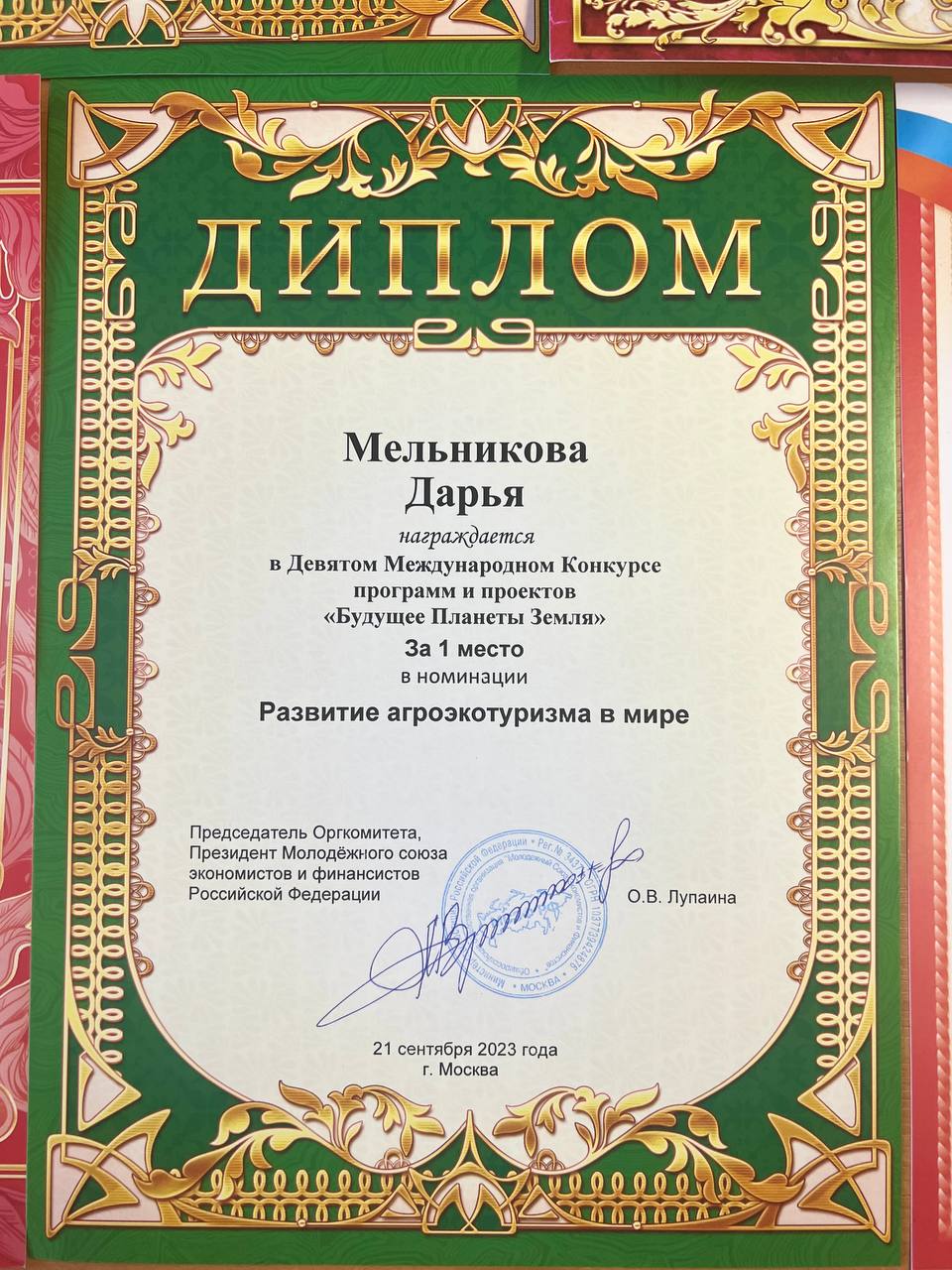 ✅ в номинации 71 «Развитие агроэкотуризма в мире» — выпускница факультета менеджмента спорта, туризма и гостеприимства ИМСиТ Мельникова Дарья Викторовна с проектом «Разработка экскурсионно-познавательного тура «По дорогам Брестчины» на базе агроусадьбы «Империя»;