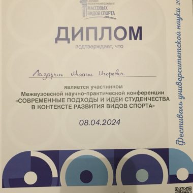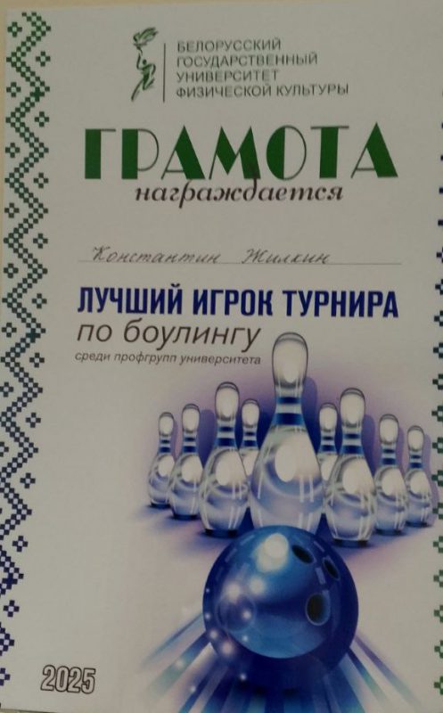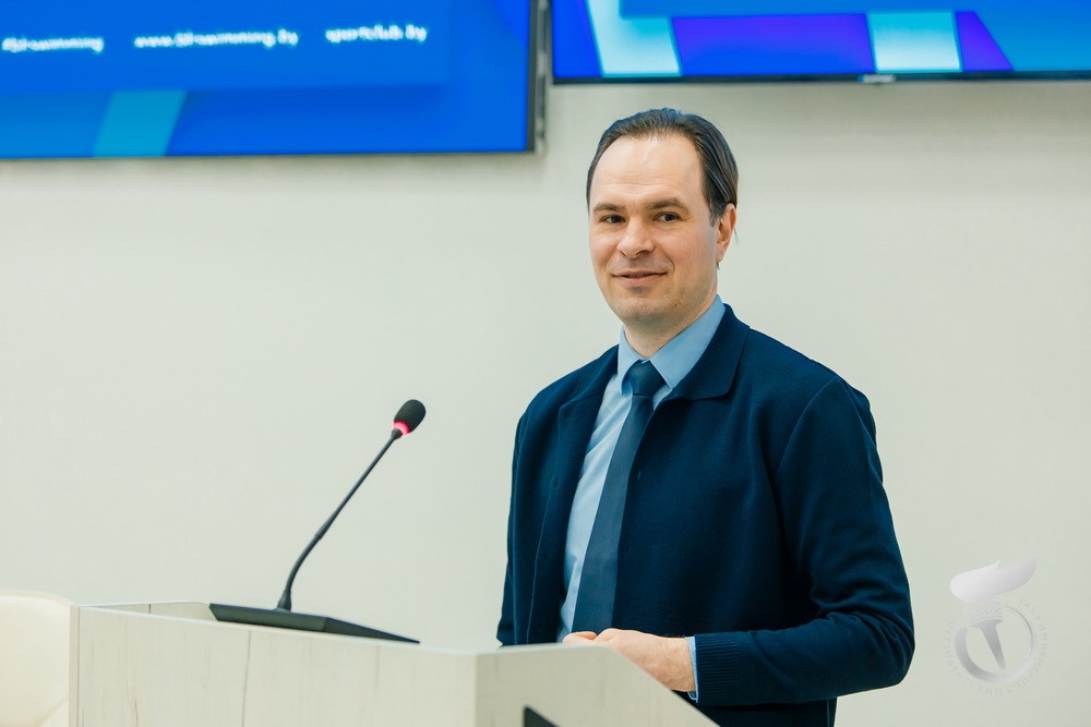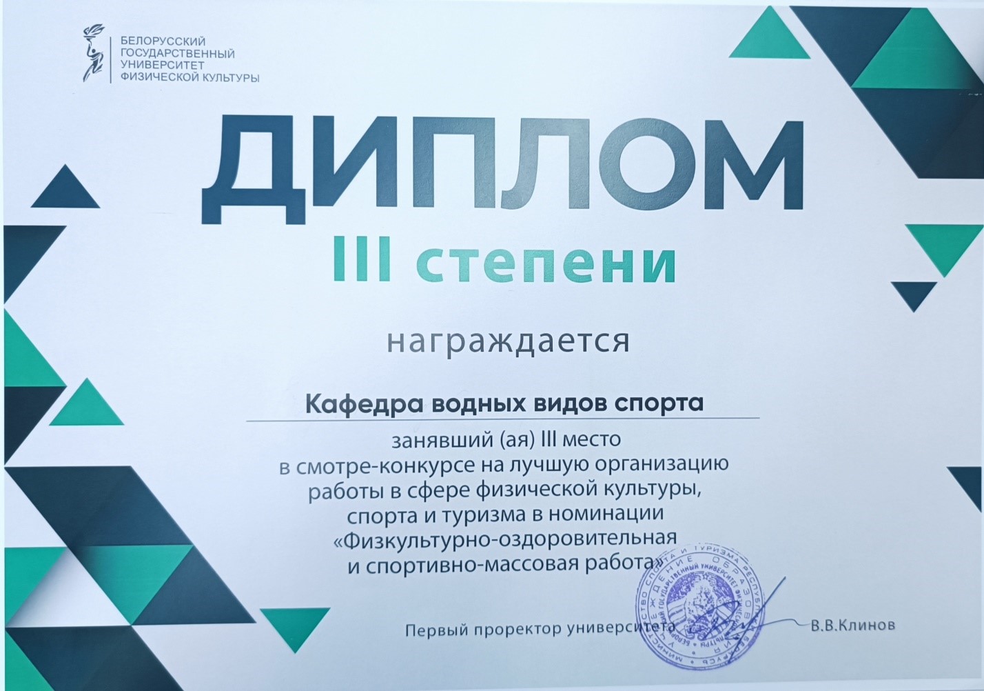 Золотой значок «Фiзкультурнік Беларусі» присвоен: Клинову Владимиру Владимировичу – первому проректору университета, доценту кафедры водных видов спорта.