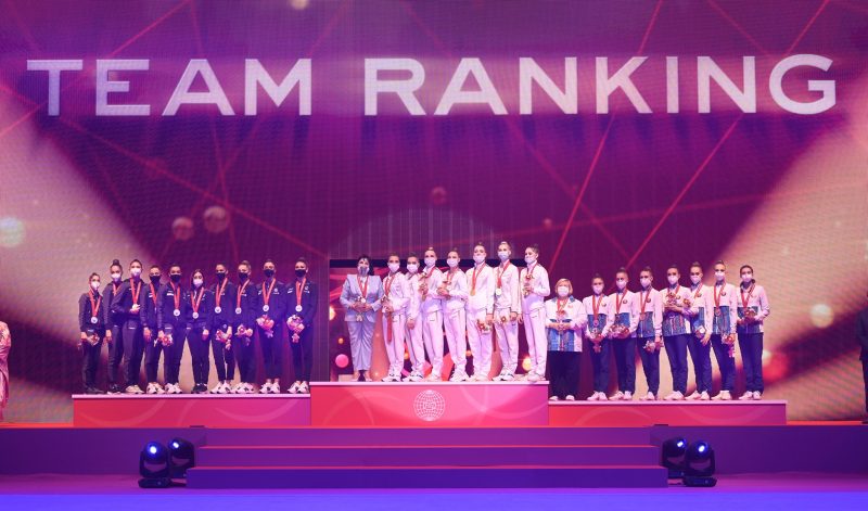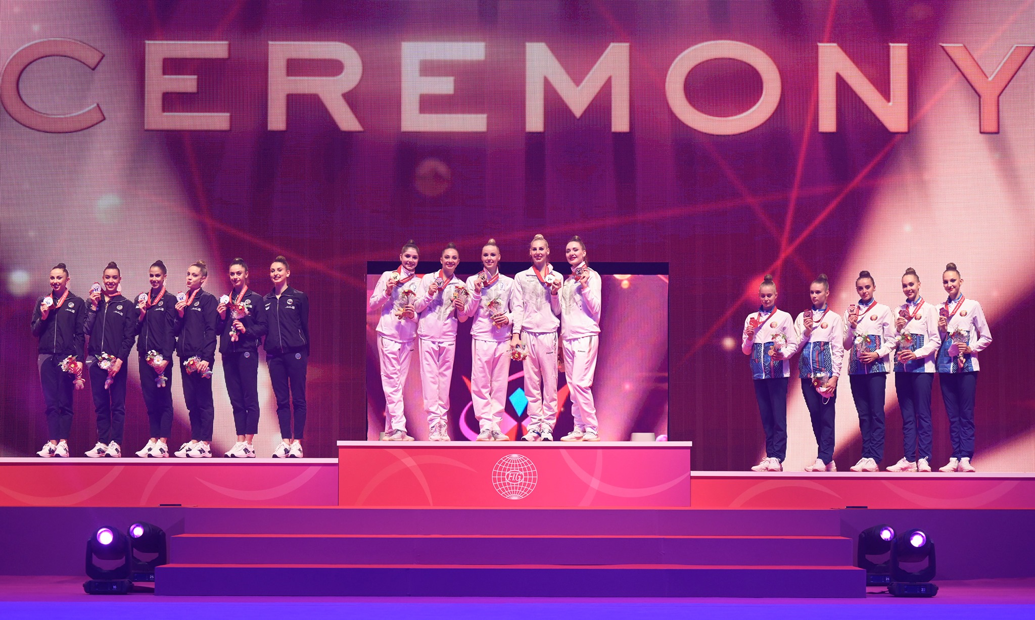 Также сегодня были подведены итоги командного зачета, куда входят результаты личниц и групповичек. И здесь сборная Беларуси на третьем месте. Совсем немного наши спортсменки уступили команде Италии. Золото – у россиянок. После трех дней соревнований у сборной Беларуси уже 6 медалей. Накануне, напомню, Алина Горносько завоевала золото в упражнении с лентой, Анастасия Салос стала третьей в композиции с булавами. Еще две награды, серебро и бронзу, Алина Горносько выиграла в первый день финалов. Завтра будем болеть за белорусок в самом престижном виде программы, индивидуальном многоборье. Следить за турниром можно на сайте Международной федерации гимнастики, прямые трансляции финалов зрителям предложит телеканал Беларусь 5. Не пропустите!!!