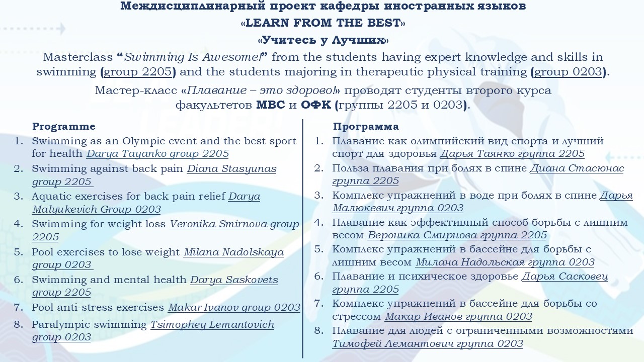 5 ноября 2025 года кафедра иностранных языков факультета оздоровительной физической культуры совместно с кафедрой водных видов спорта спортивно-педагогического факультета массовых видов спорта организовали Междисциплинарный проект «LEARN FROM THE BEST» («Учитесь у лучших»).