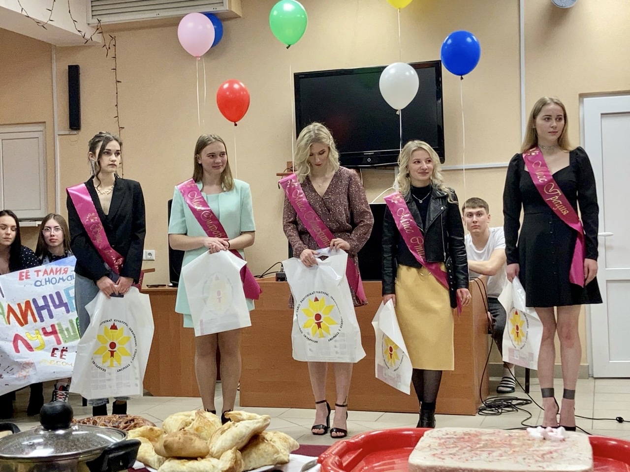После завершающего конкурса председатель жюри Сергей Лукашенко сказал слова благодарности и вручил вместе с комендантом Кристиной Вишневской ленты-номинации, а председатель профкома студентов Павел Корсак вручил от студенческого профсоюза университета подарки участницам.