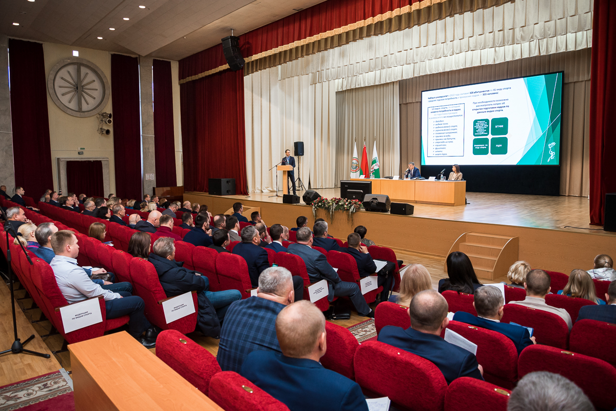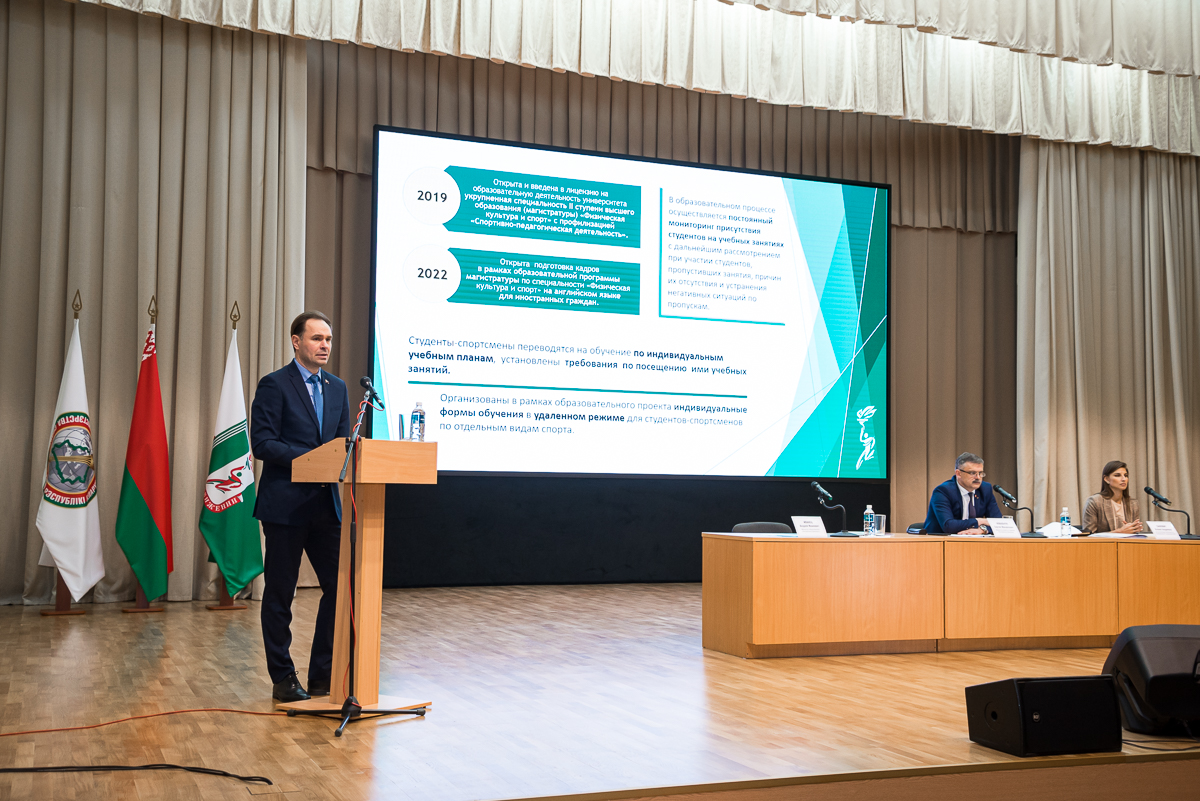 Ректор БГУФК Сергей Борисович Репкин в своем докладе подробно остановился на том, что было сделано для совершенствования образовательного процесса и повышения качества подготовки специалистов в университете: разработана новая учебно-программная документация, изданы учебные издания и ЭУМК, утверждены новые образовательные стандарты по специальностям высшего образования, обновлена структура подготовки кадров, всего в университете обучаются по 41 виду спорта. Для эффективной подготовки тренерских кадров совместно с федерациями проводятся научно-практические семинары и круглые столы. Организованы в рамках образовательного проекта индивидуальные формы обучения в удаленном режиме для студентов-спортсменов по отдельным видам спорта. При формировании плана набора абитуриентов университет придерживается концепции развития видов спорта с учетов потребности в кадрах. Подробно рассказал о разработанной системе «Кадры отрасли». Вместе с тем, имеются проблемы закрепления выпускников на местах распределения, это еще связано и с тем, что парни после окончания вуза уходят в армию. В связи с этим инициирован вопрос о создании в БГУФК военной кафедры.