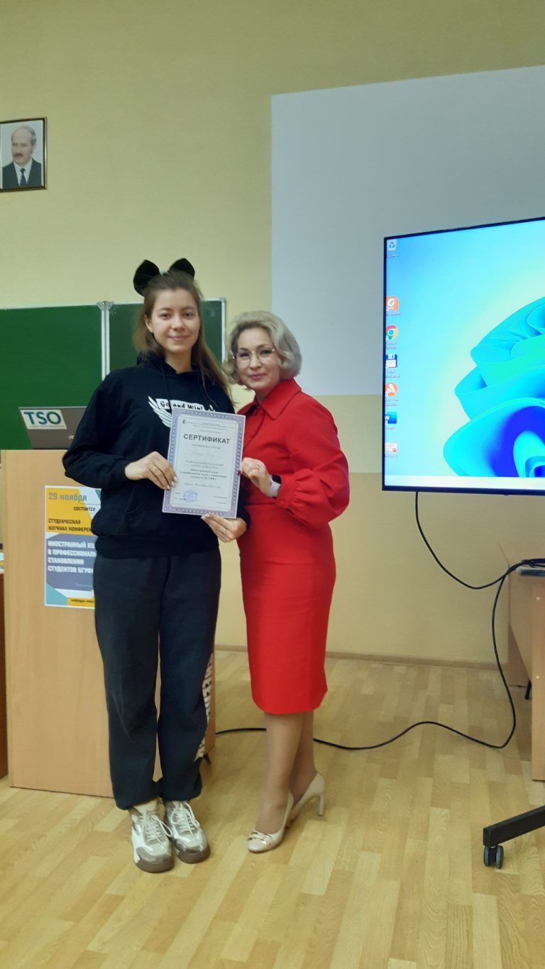 Костюк Юлия (4206 группа) с докладом «Особенности системы подготовки тренеров по чирлидингу в США и Республике Беларусь», научный руководитель: Федорук Наталья Анатольевна, старший преподаватель кафедры иностранных языков.